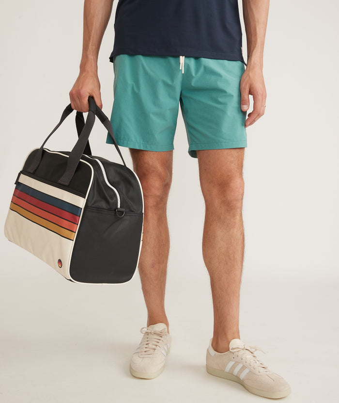 The retro-inspired gym bag that does all the hard work for you. It's got a custom vintage stripe, external zip and side pockets, a slide-through sleeve (so you can travel with ease), and a moisture-wicking pouch for your dirty clothes. See? No need to sweat it.