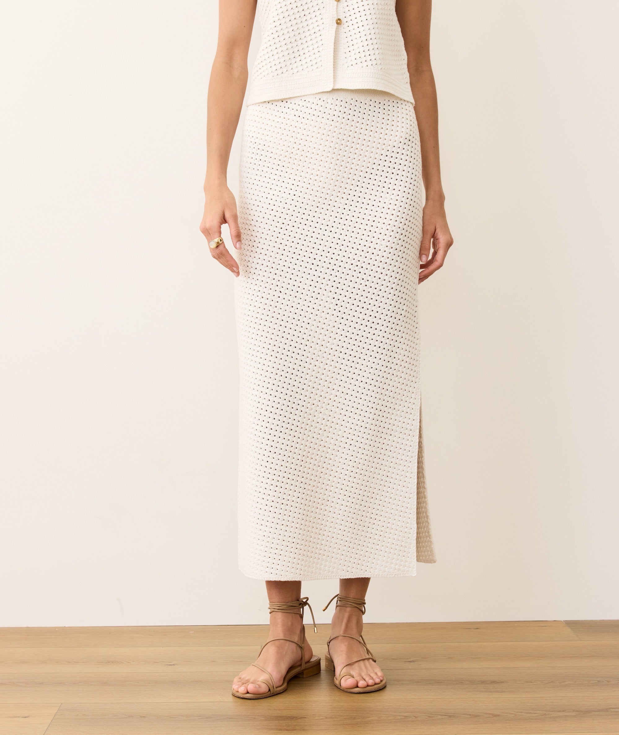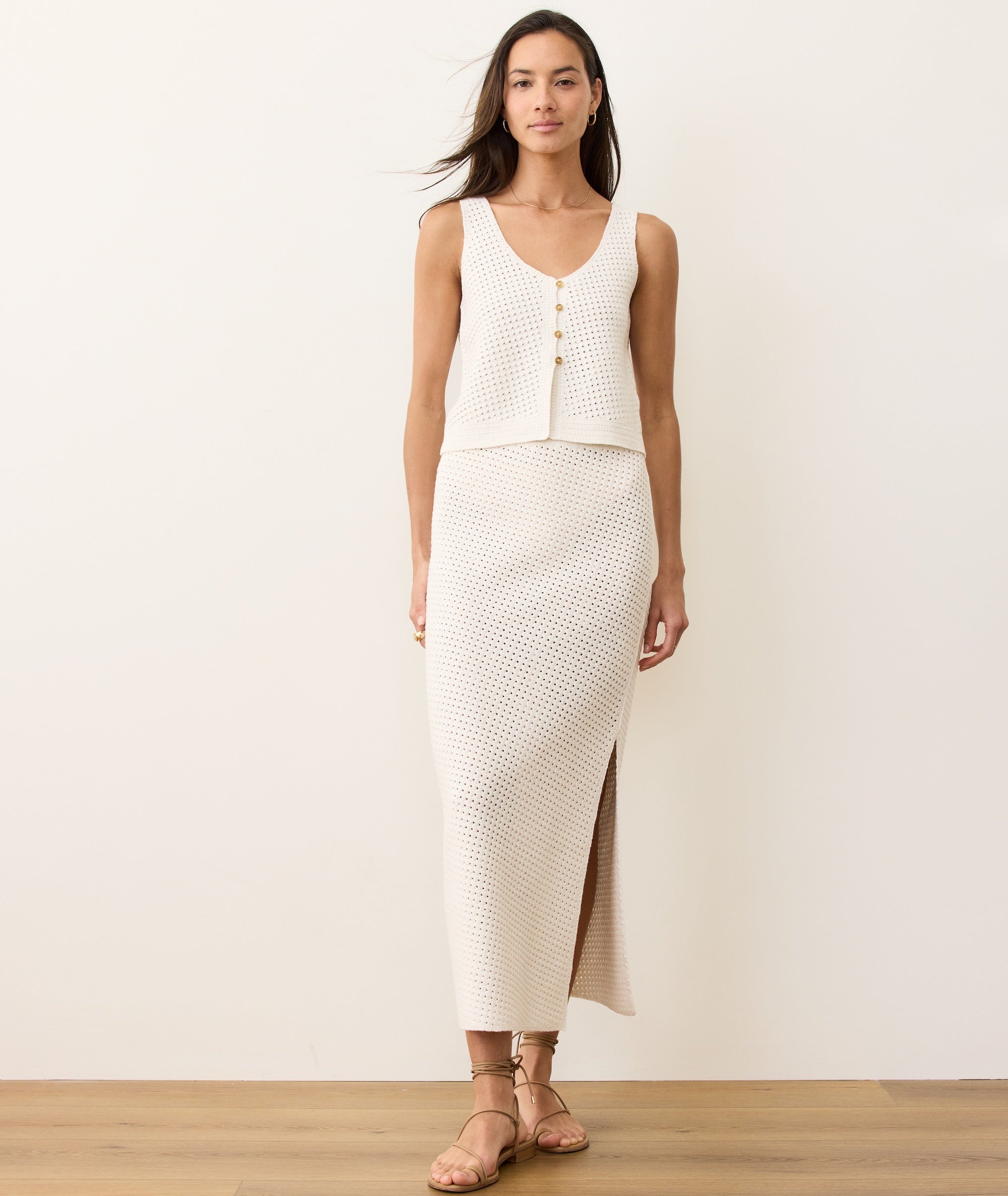 This maxi has a column fit — meaning it skims the body without clinging, for that streamlined look that still lets you move. The diagonal crochet stitch gives it texture (and a little attitude), while the knit elastic waist keeps things comfortable. Pair it with the matching tank and pretend you’re on a rooftop in Sicily.