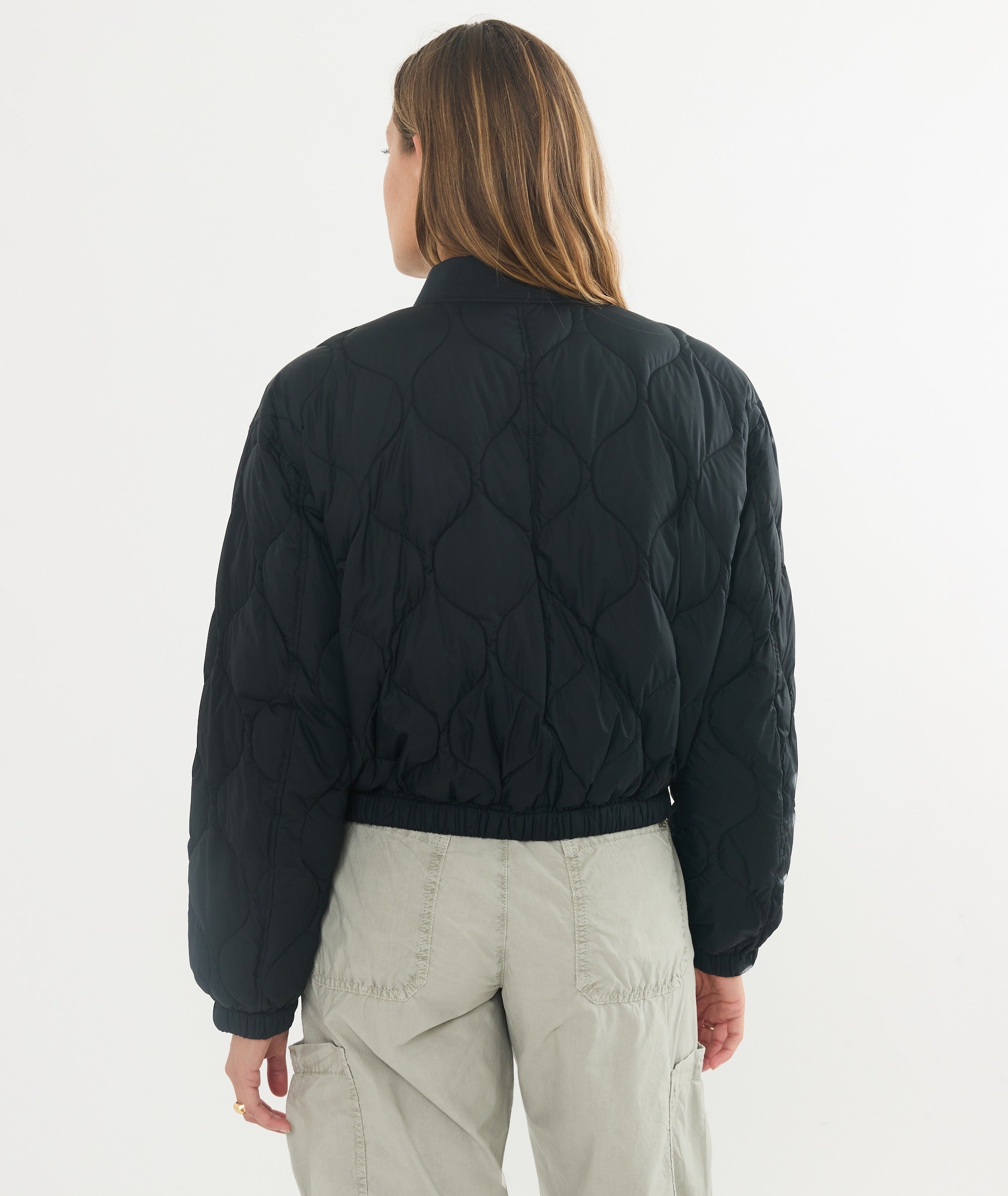 We wanted to make an easy, versatile jacket that you can wear pretty much anywhere. This quilted bomber is slightly oversized, has a subtly cropped length, interior and exterior pockets, as well as a warm, incredibly lightweight nylon fabric. So go ahead, wear it on your morning walks, to the farmers market, parklet dinners, you name it.