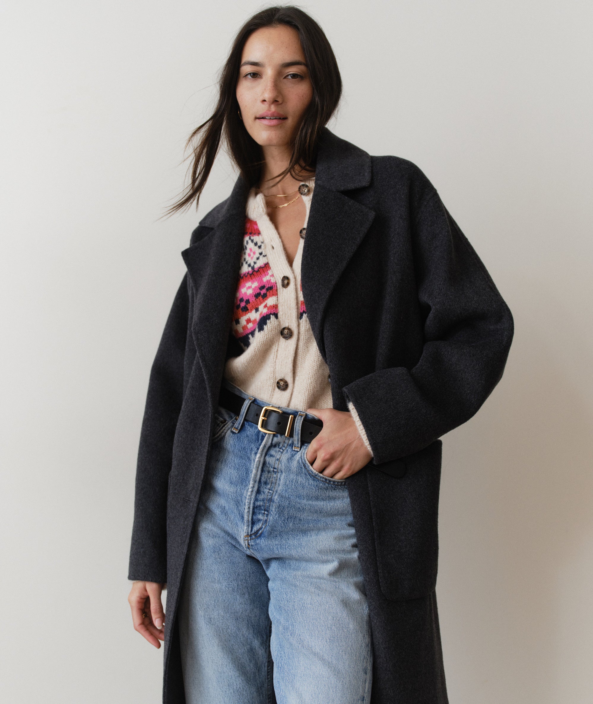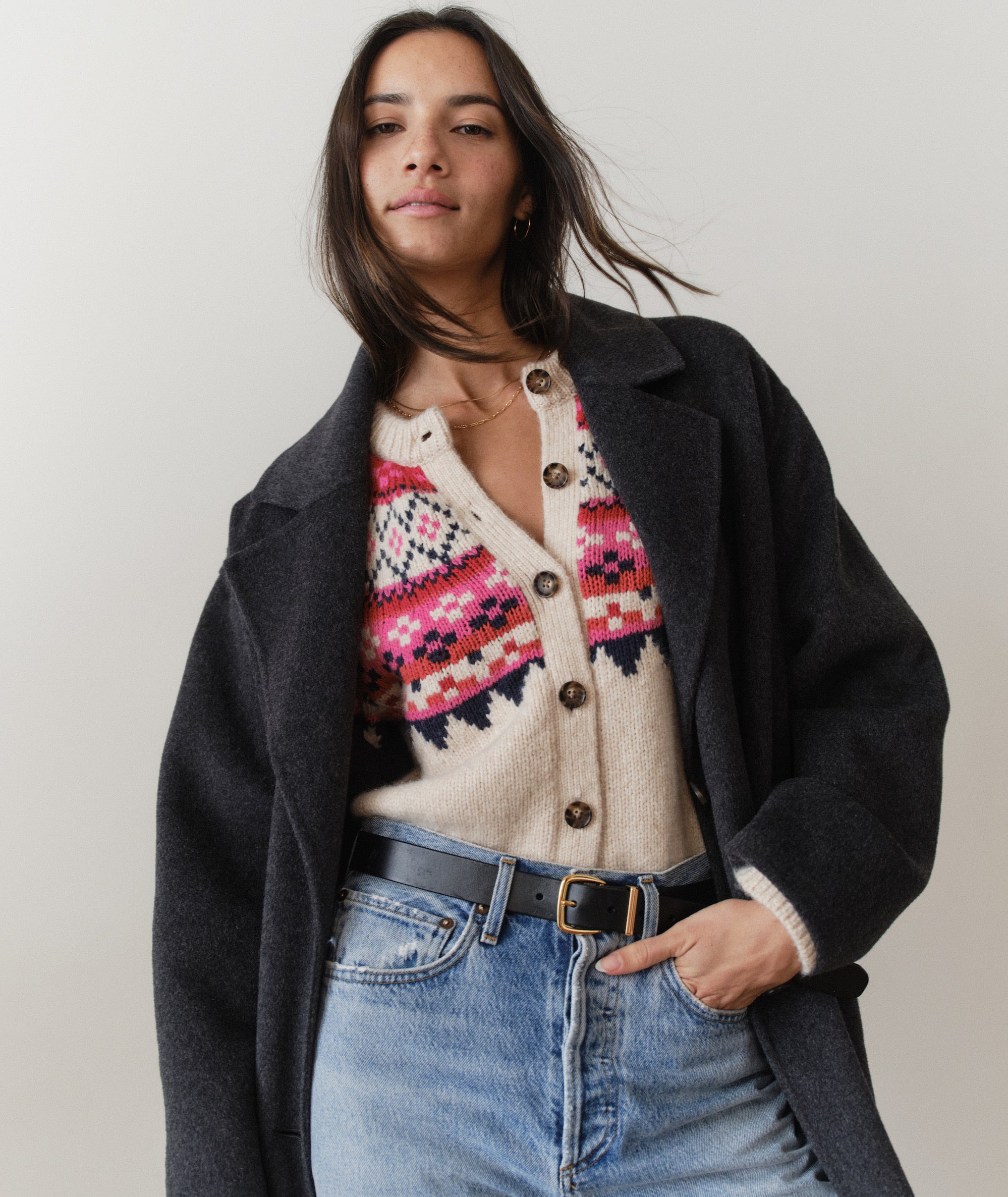 If you love a Fair Isle sweater, but want a few more styling options? This cardigan is your girl. She has an easy relaxed fit, but a high hip length to keep things from feeling oversized. With the new colors this year, we're including a first-ever true neutral in gray. Did we mention there are matching hats for all the colors? There are matching hats.