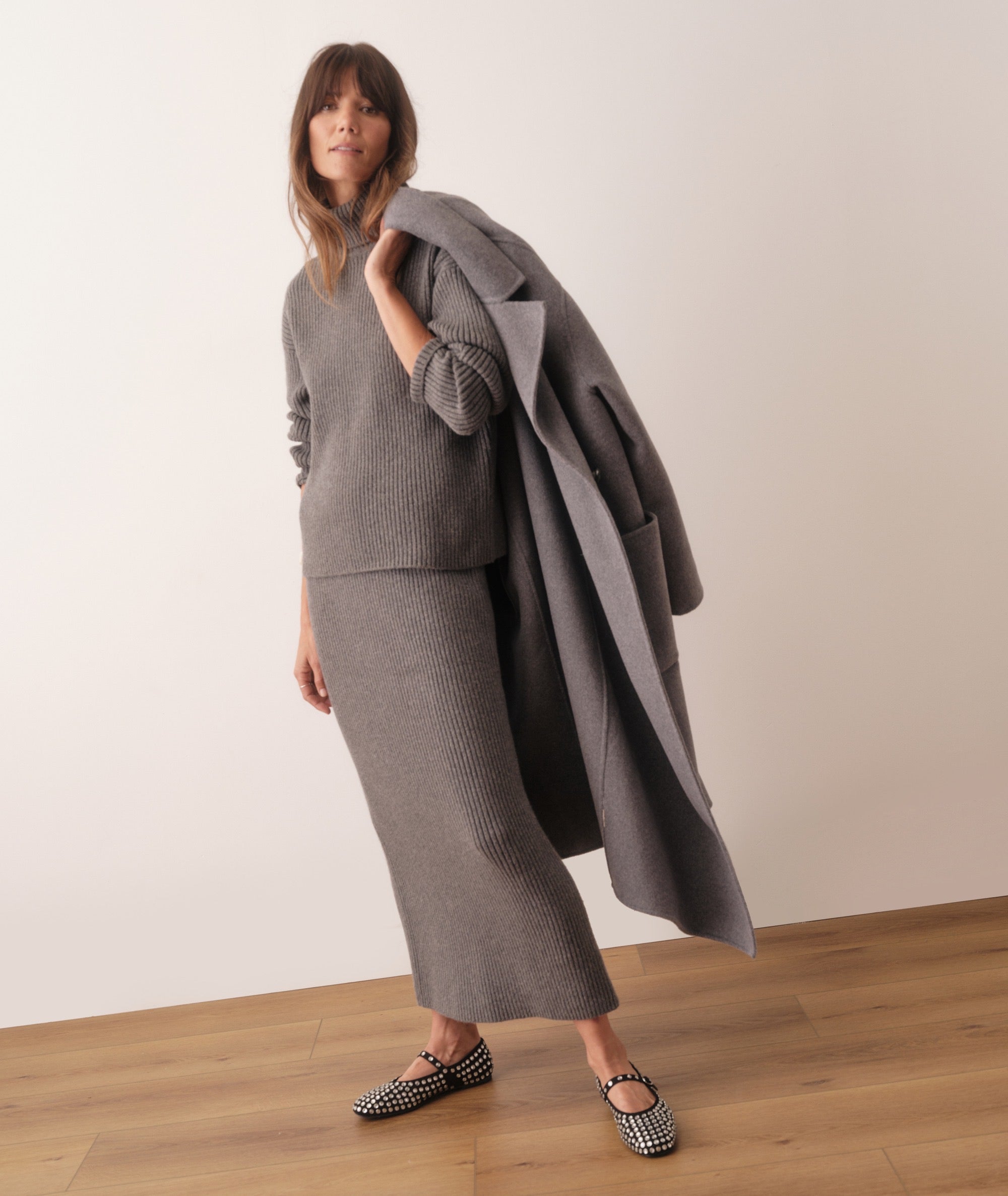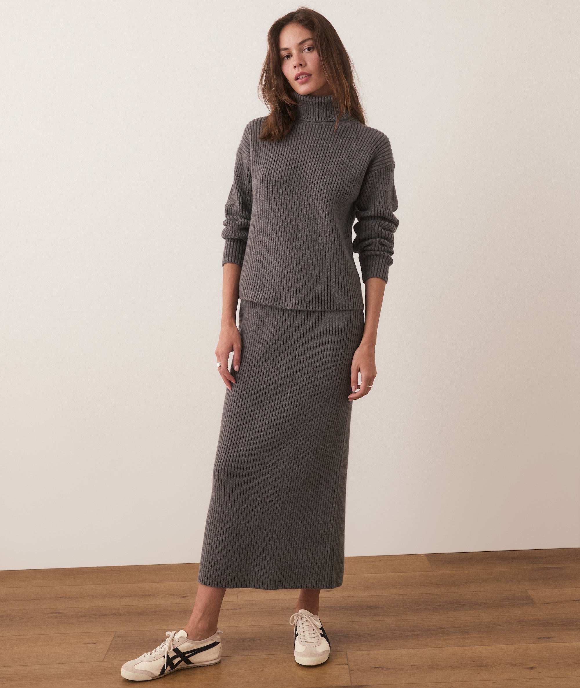 Our softest, most versatile skirt ever. This new style is absurdly warm and cozy, with a soft, ribbed fabric. It has an elastic waist, two side slits, and features a coordinating sweater (if you're into that sort of thing).