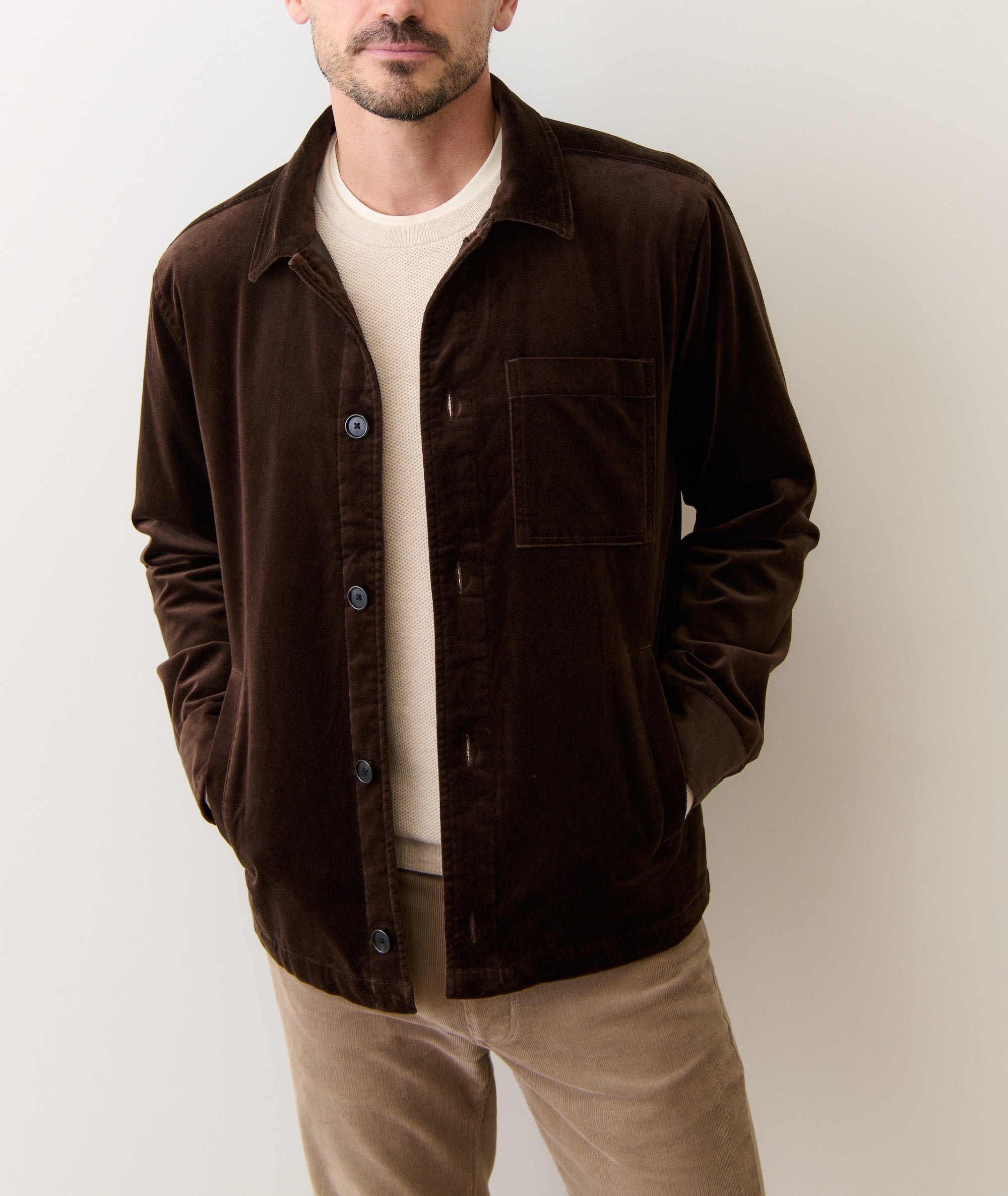 In our book, a velvet blazer is just a little too dressed up. Enter this velvet overshirt: here to make the parade of holiday parties feel a little more comfortable and a lot more fun. With an ultra stretchy fabric, and an easygoing overshirt style, it's perfect to throw on with a sweater tee and be the best-dressed, most laid back person on the dance floor.
