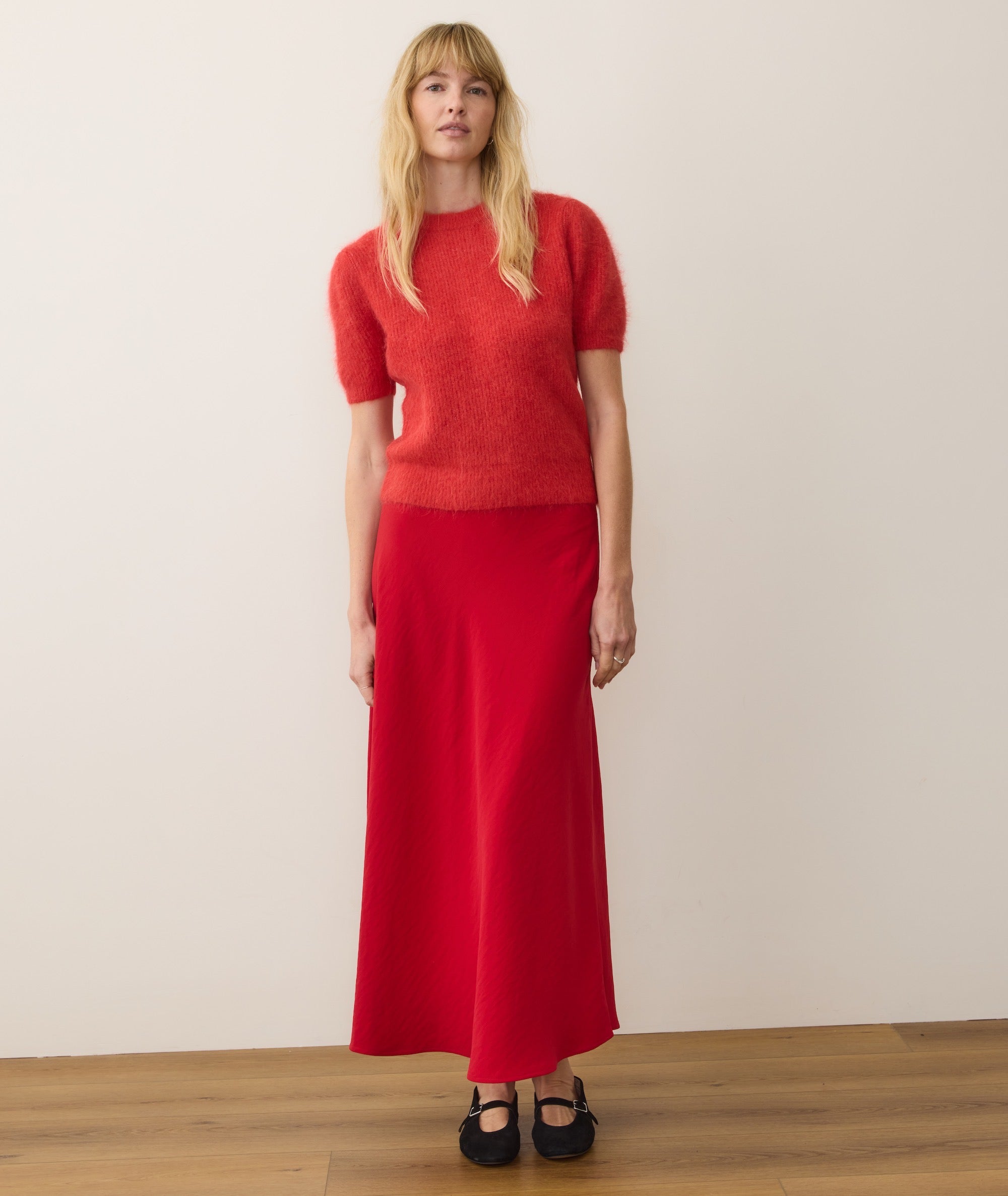To put it simply, we love this circle skirt. It's flowy and twirl-worthy, but has a creped fabric that feels a little more relaxed. The perfect blend of a cute style and enough comfort to make you want to wear it every day. We love to wear it with a red sweater for a monochrome moment, or something green if we have to head to a holiday party.