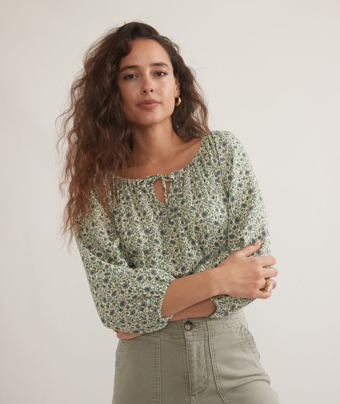 This 70s boho blouse is cinched at the waist, has 3/4 length sleeves, and coordinates perfectly with high-waisted pants, shorts, you name it.