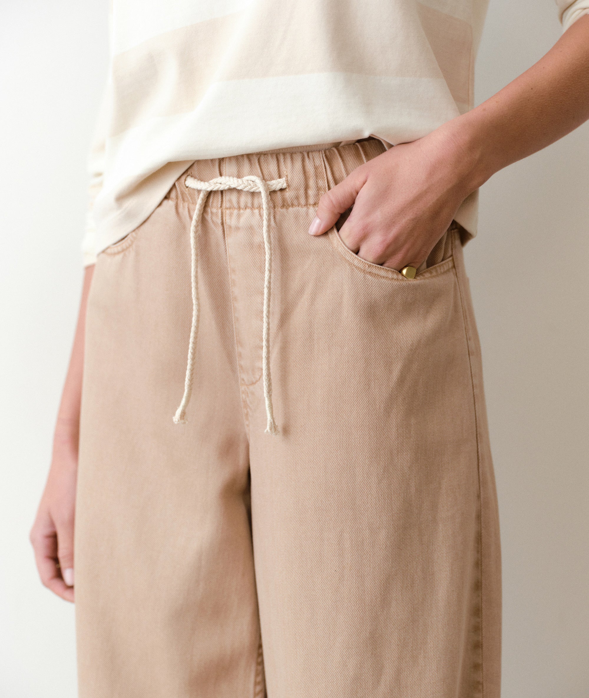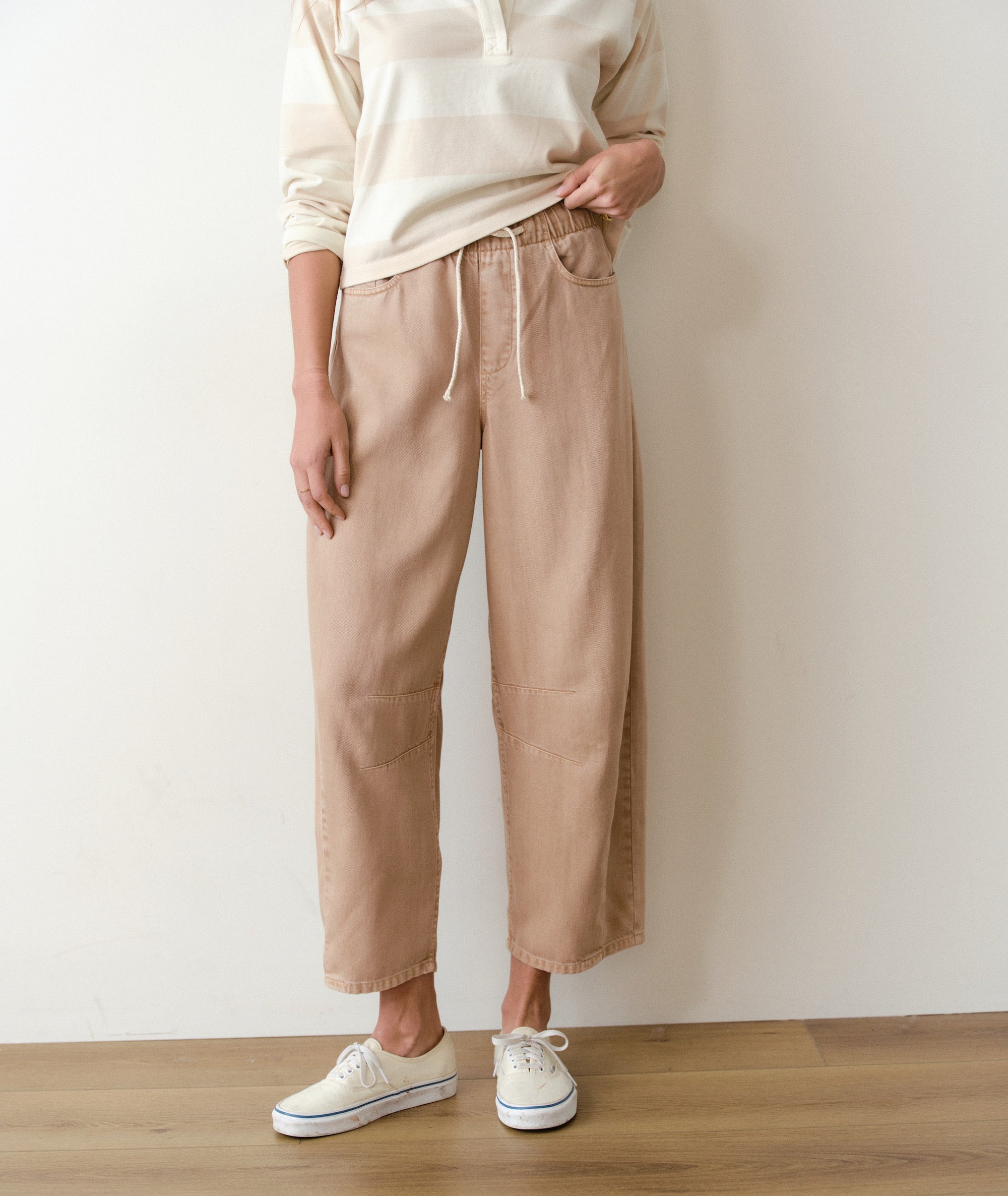 Good news: our brand new Ella pant is nothing like the other barrels you've tried on. Instead of feeling pinchy and stiff, they've got an effortless pull-on waist, the softest broken-in fabric, and a bold horseshoe barrel that looks so cute no one will ever guess how secretly comfy you are. That will just be our little secret.