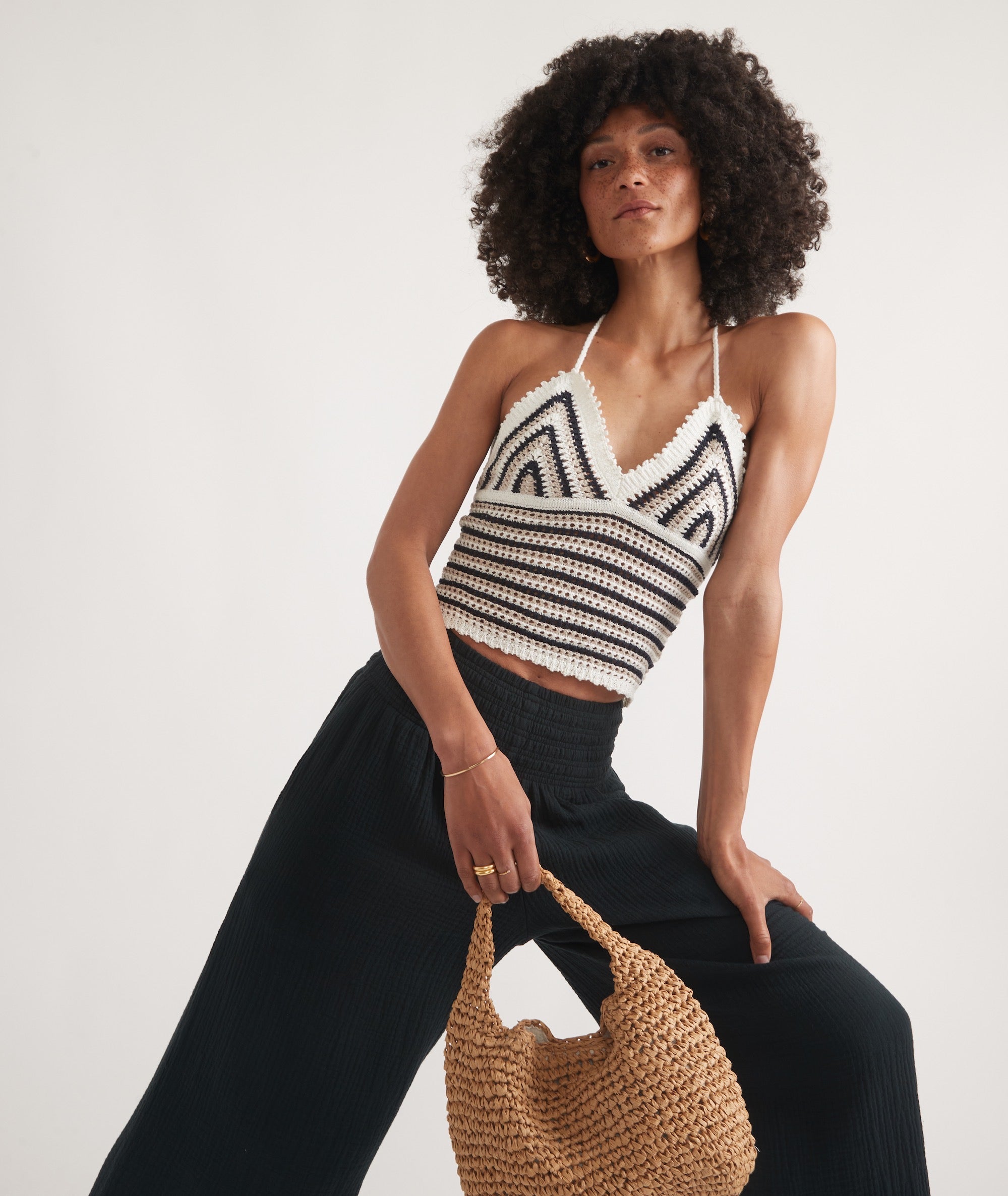 Inspired by crochet tops from the '70s, this new halter top features a fitted, cropped fit, adjustable ties at the neck, and a knit, summery fabric meant to be a little sheer. Pair it with your favorite denim, shorts, or skirt and you're ready to roll.