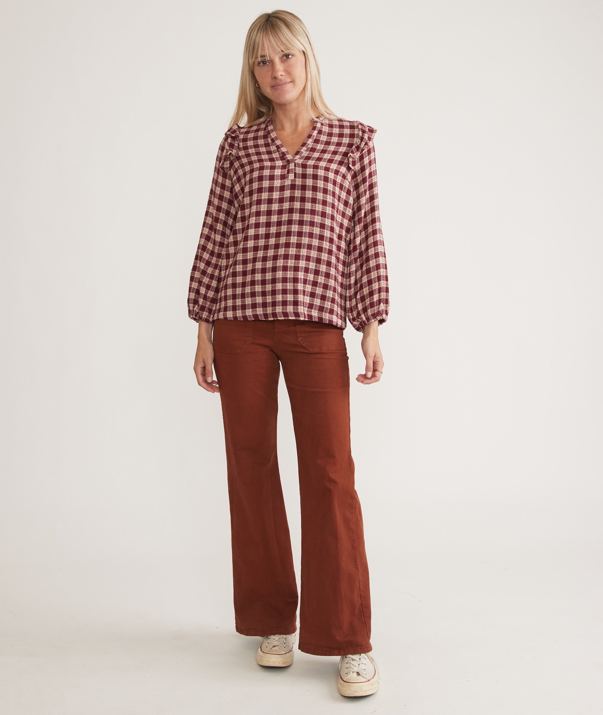 A classic holiday shirt, but make it ML. This style is incredibly soft, with a cozy (yet drapey) fabric and delicate ruffle details. Throw it on with some jeans and boots and call it a day.