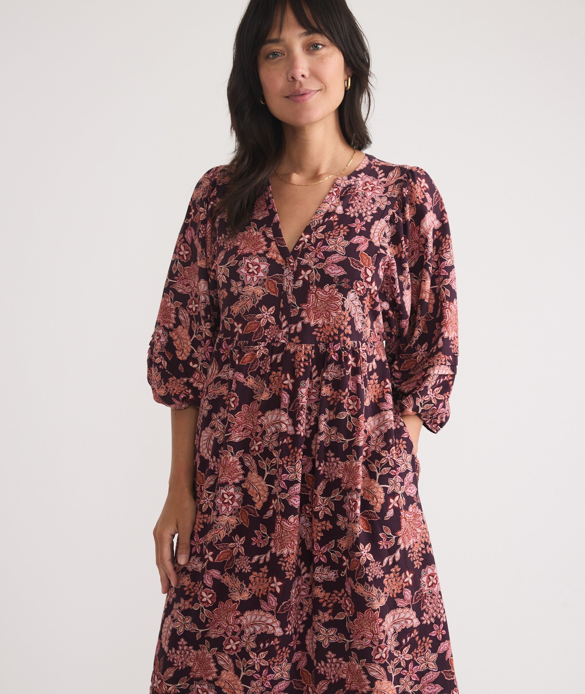 Throw on this easy, bohemian dress, some boots or sneakers, and hit the town. This dress features a v-neck placket, subtle balloon sleeves, and pockets (!)