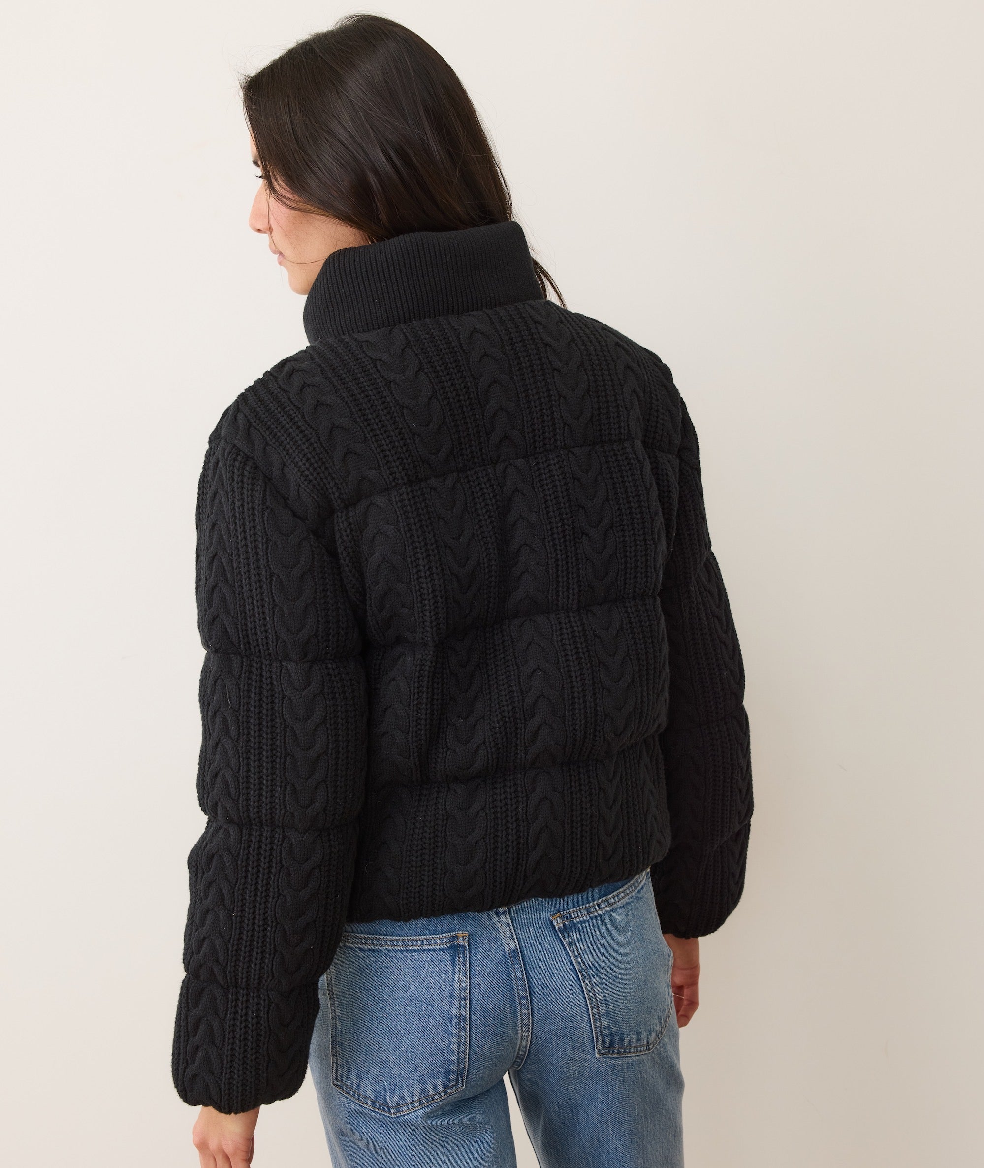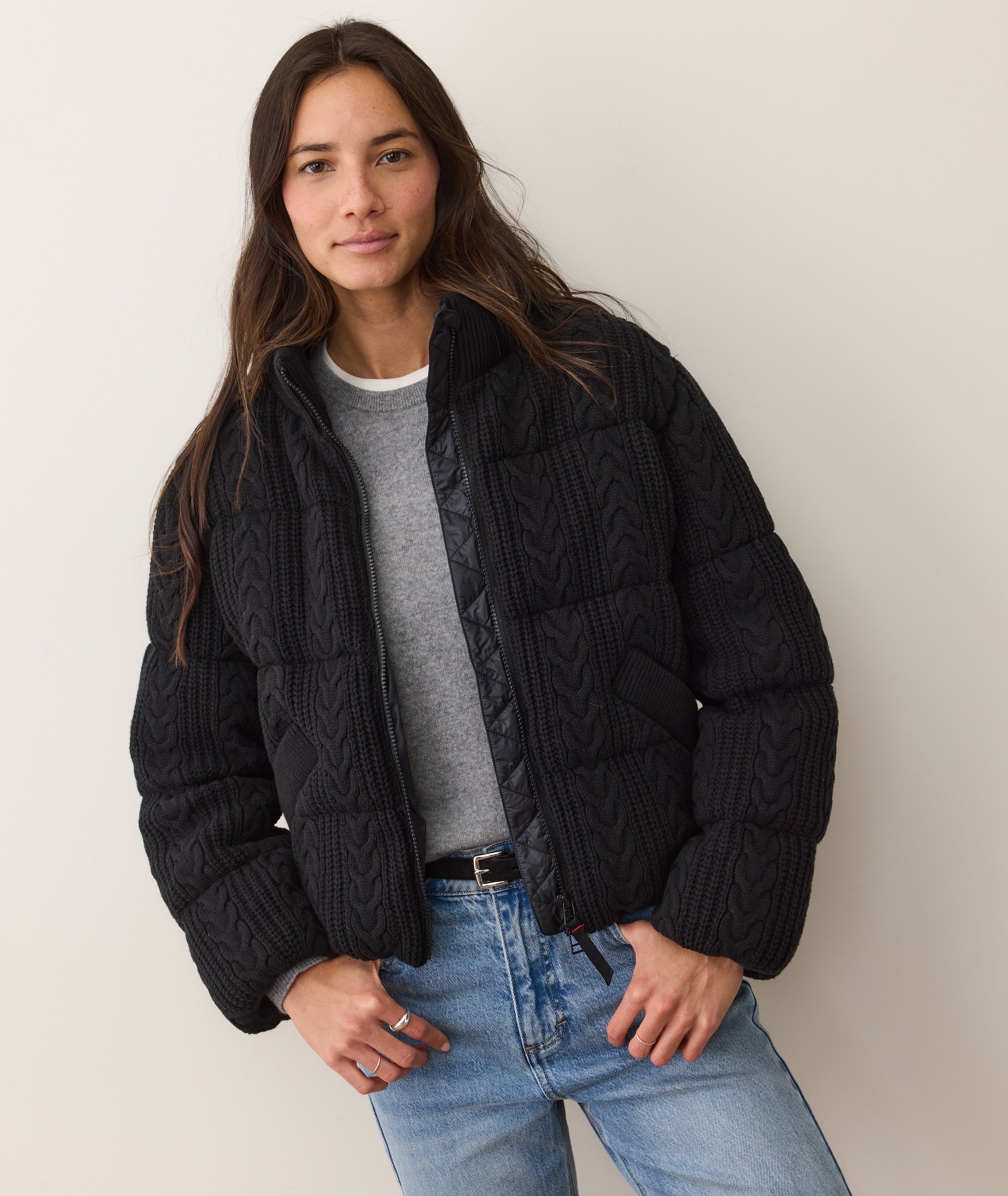 We love a nylon puffer, but some days you just want that cozy feel of a soft winter sweater. So we created this jacket with the warmth and loft of a puffer and the soft texture of a cable knit.