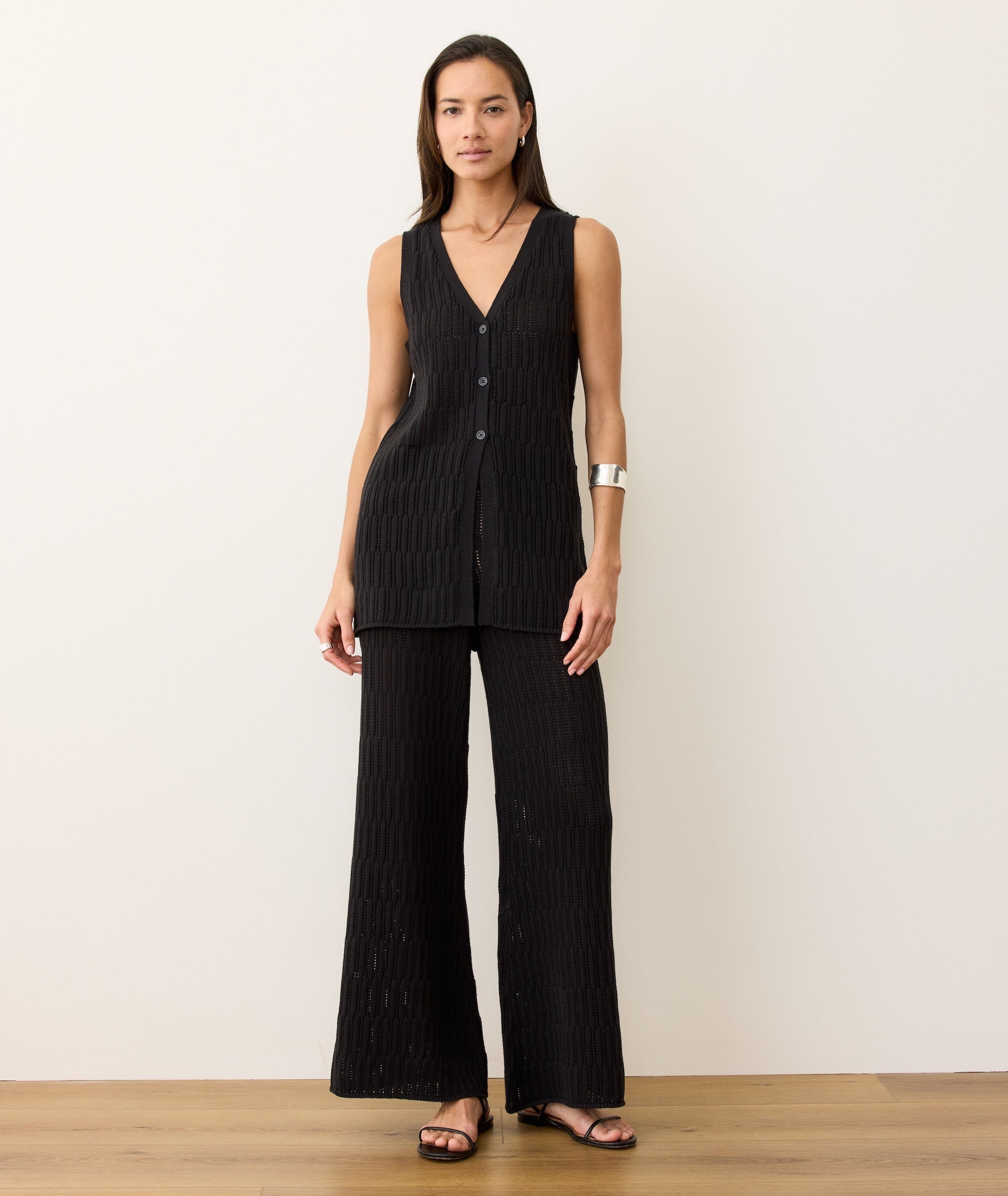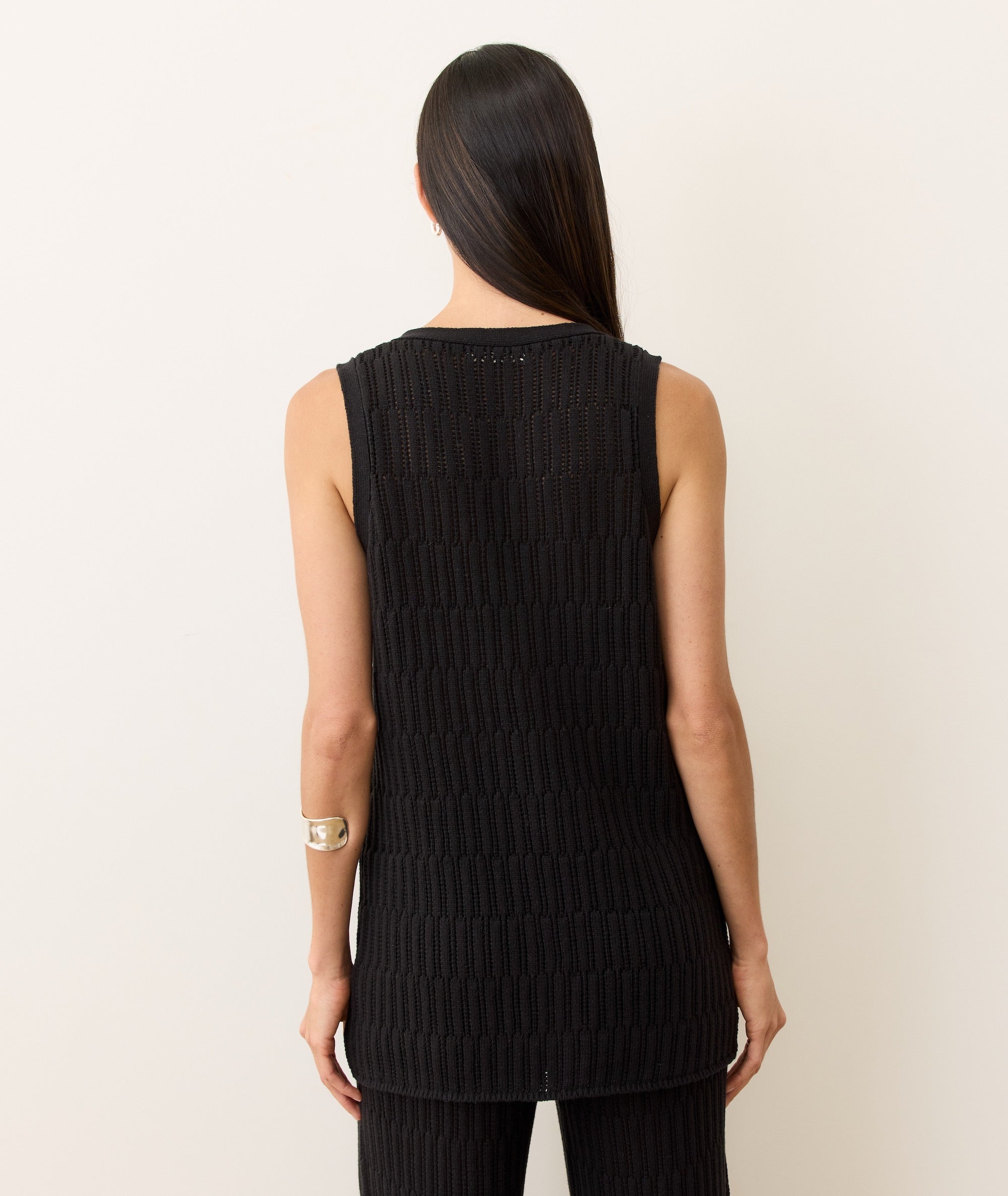 Vacation mode, activated. This breezy, button-up tank is part vest, part top, and 100% easy. Made from our airy cotton crochet, it’s got a flattering v-neck, a longer length, and pairs perfectly with the matching pants (or a bikini and a marg).