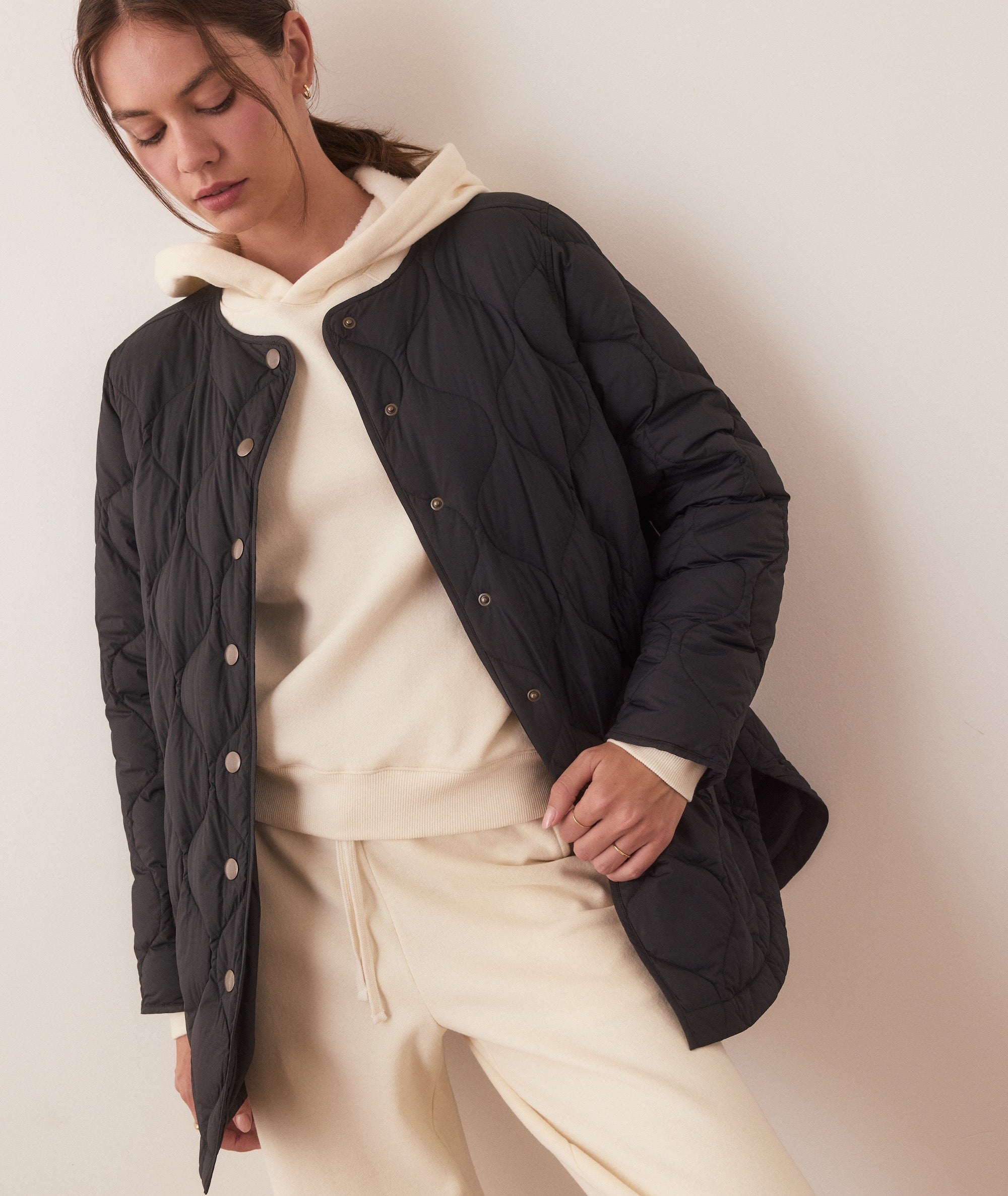 We wanted to make an easy, versatile jacket that you can wear pretty much anywhere. This quilted jacket features a curved hem, modern collarless neckline, interior and exterior pockets, as well as a warm, incredibly lightweight nylon fabric. So go ahead, wear it on your morning walks, to the farmers market, parklet dinners, you name it.