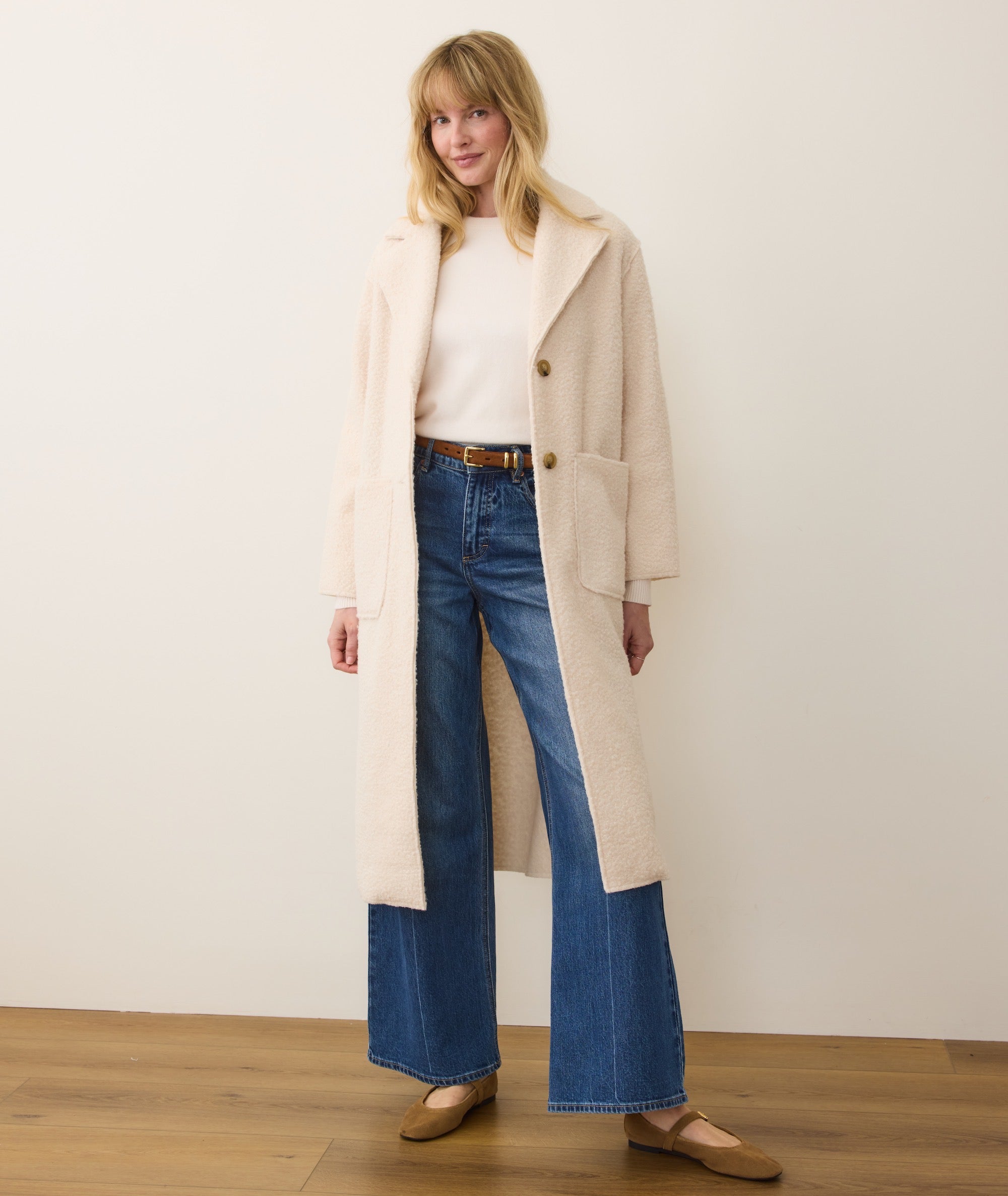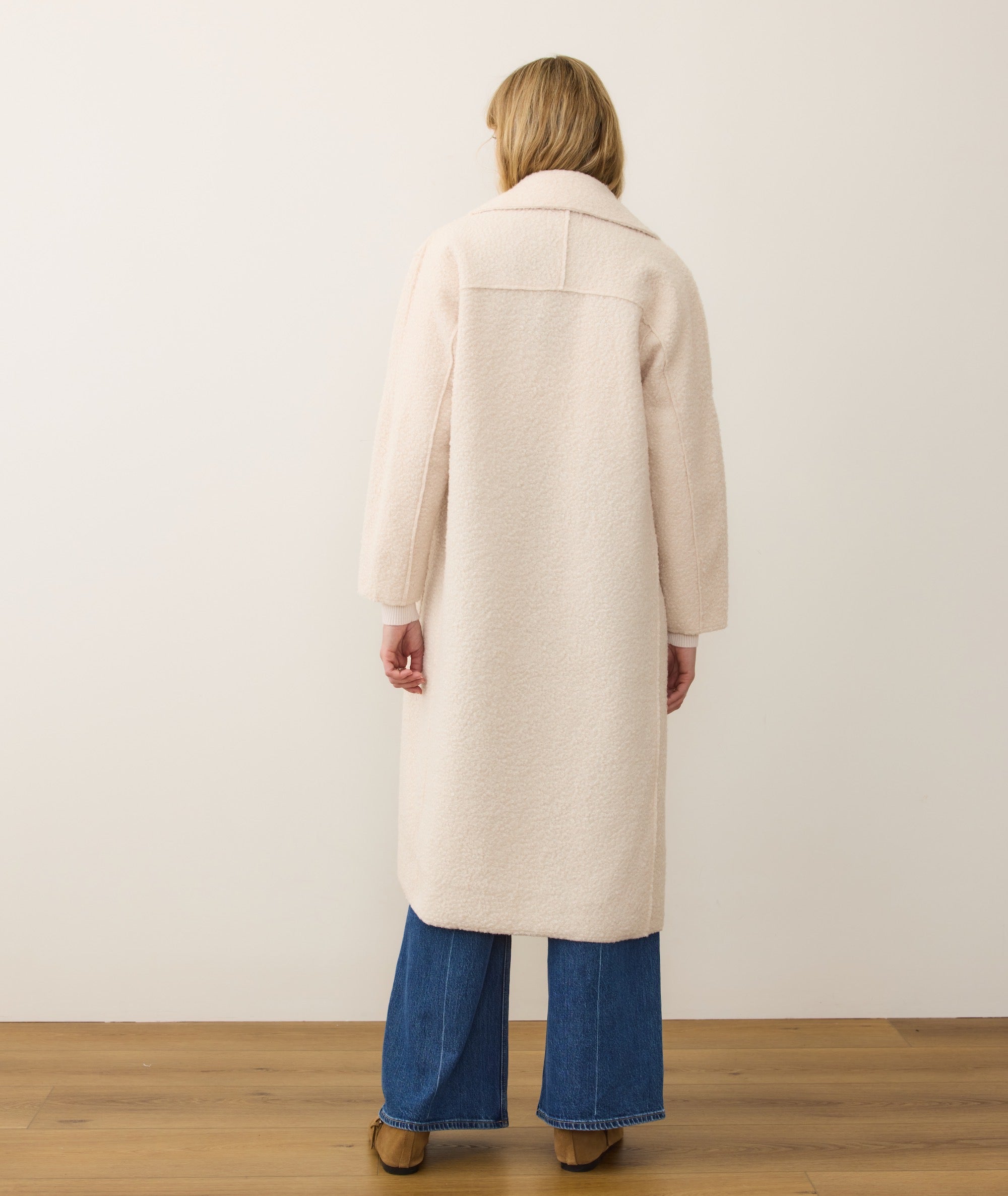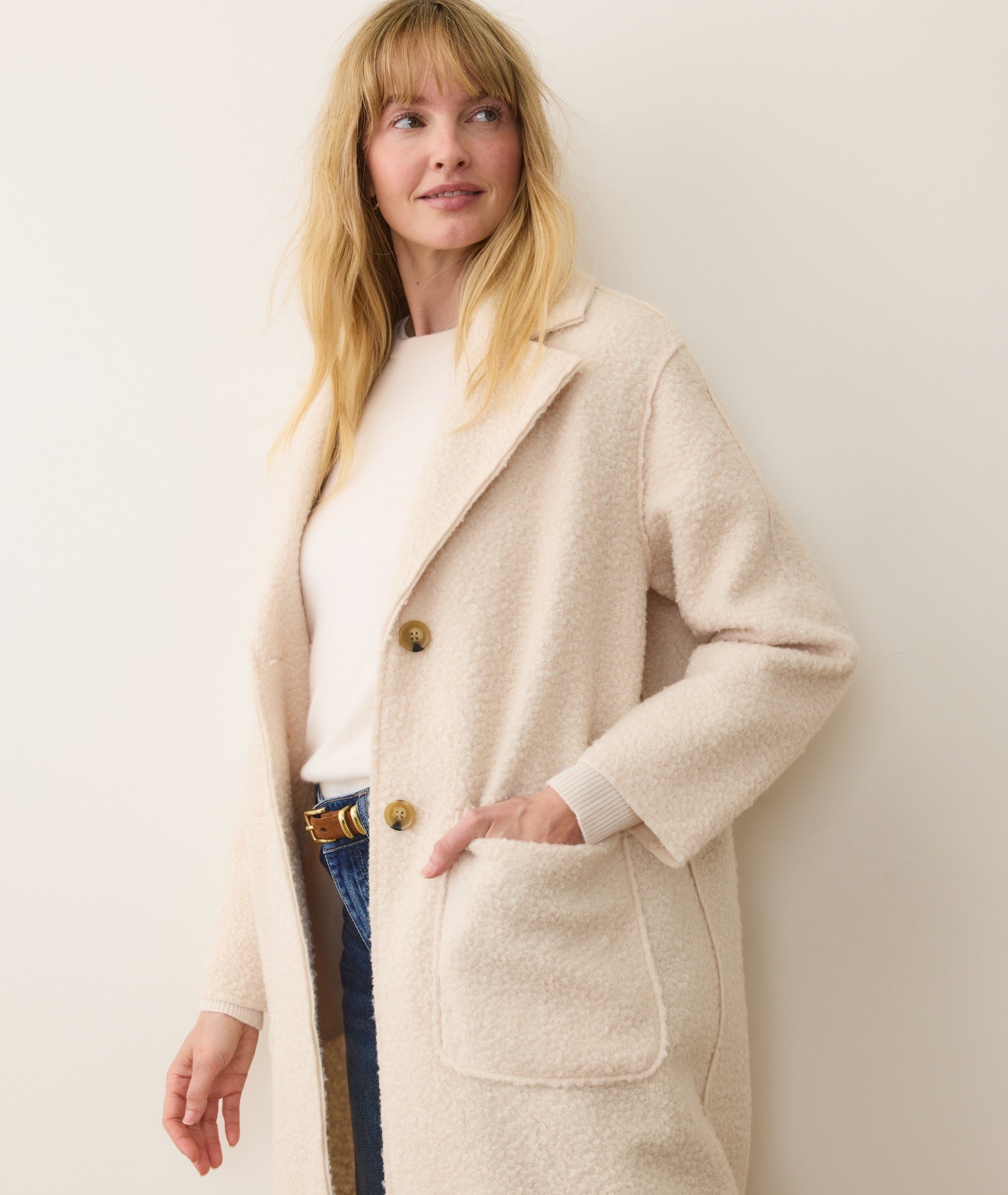 After selling out of our camel Colette coat last year, we wanted to reimagine the style to be even more versatile. So we took the silhouette and redesigned it in this supple boucle that's lightweight enough to wear anywhere, and soft enough to feel cozy. It's the perfect coat for running around town, shopping, and all the times you don't want to have to hang your coat up the minute you come inside.