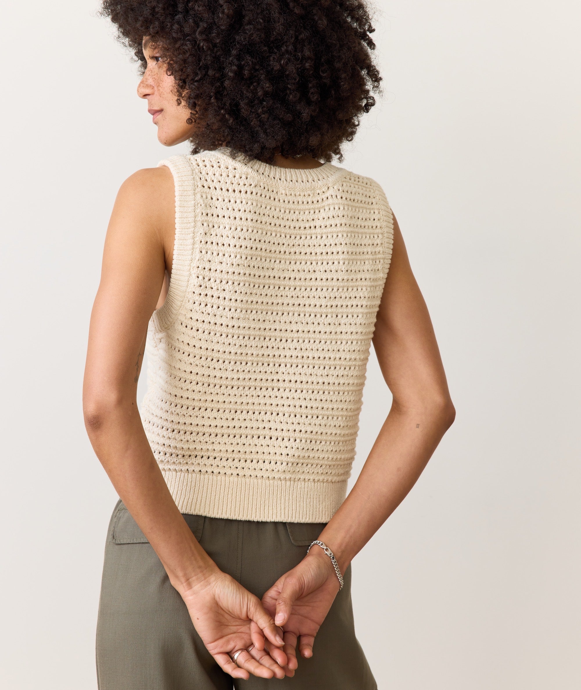 We're channeling our inner Coastal Grandmother with this one. This new style is your new go-to for seaside strolls and sunset hangs. Crafted from an airy open-knit fabric, this sweater vest gives you just the right amount of warmth without ever feeling heavy. The fit? Relaxed and slightly cropped for that comfortable, laid-back look, like you’ve mastered coastal cool without even trying. Toss it on over a tank, bikini top, or just your sun-kissed skin—it layers beautifully but looks just as good solo.