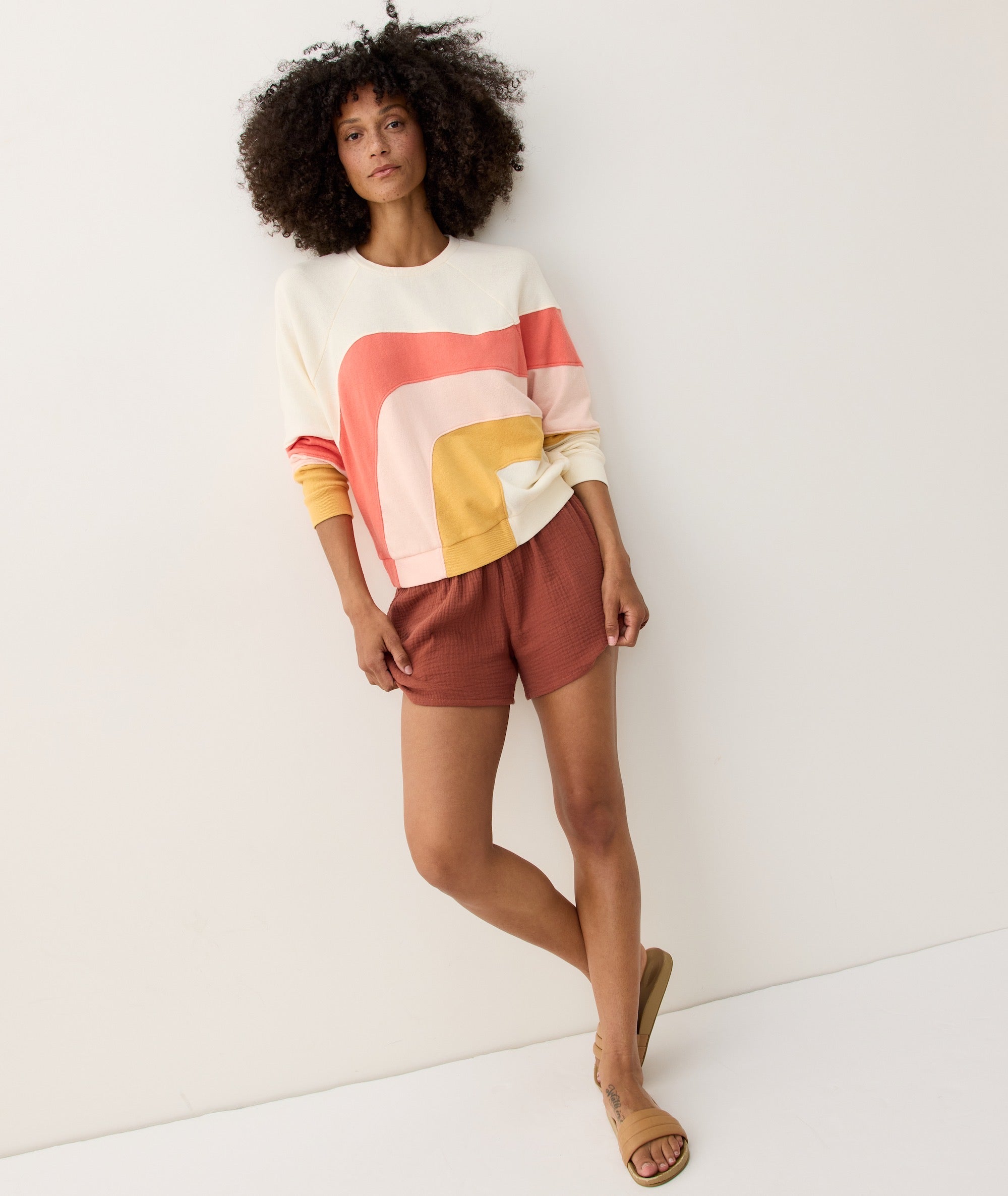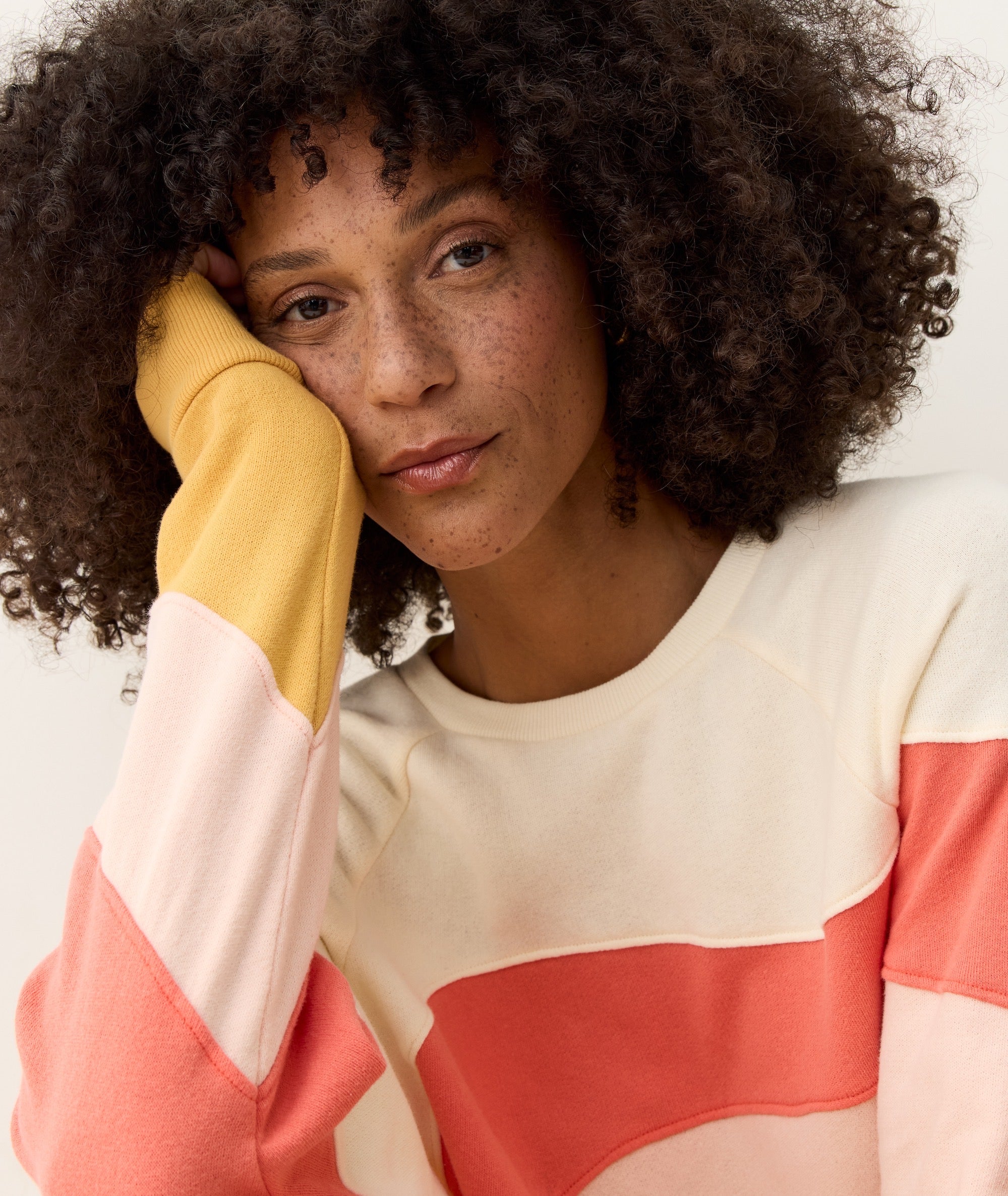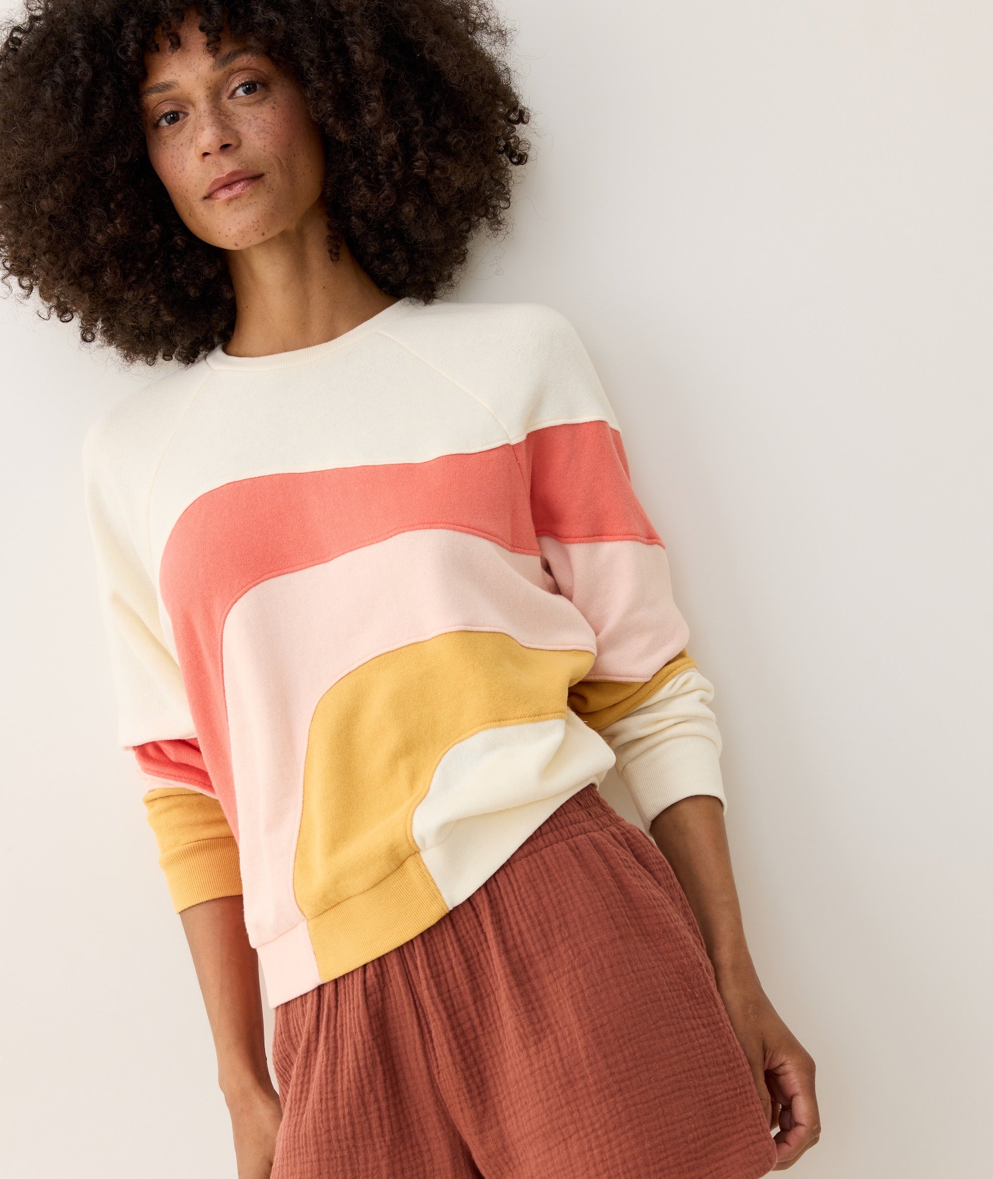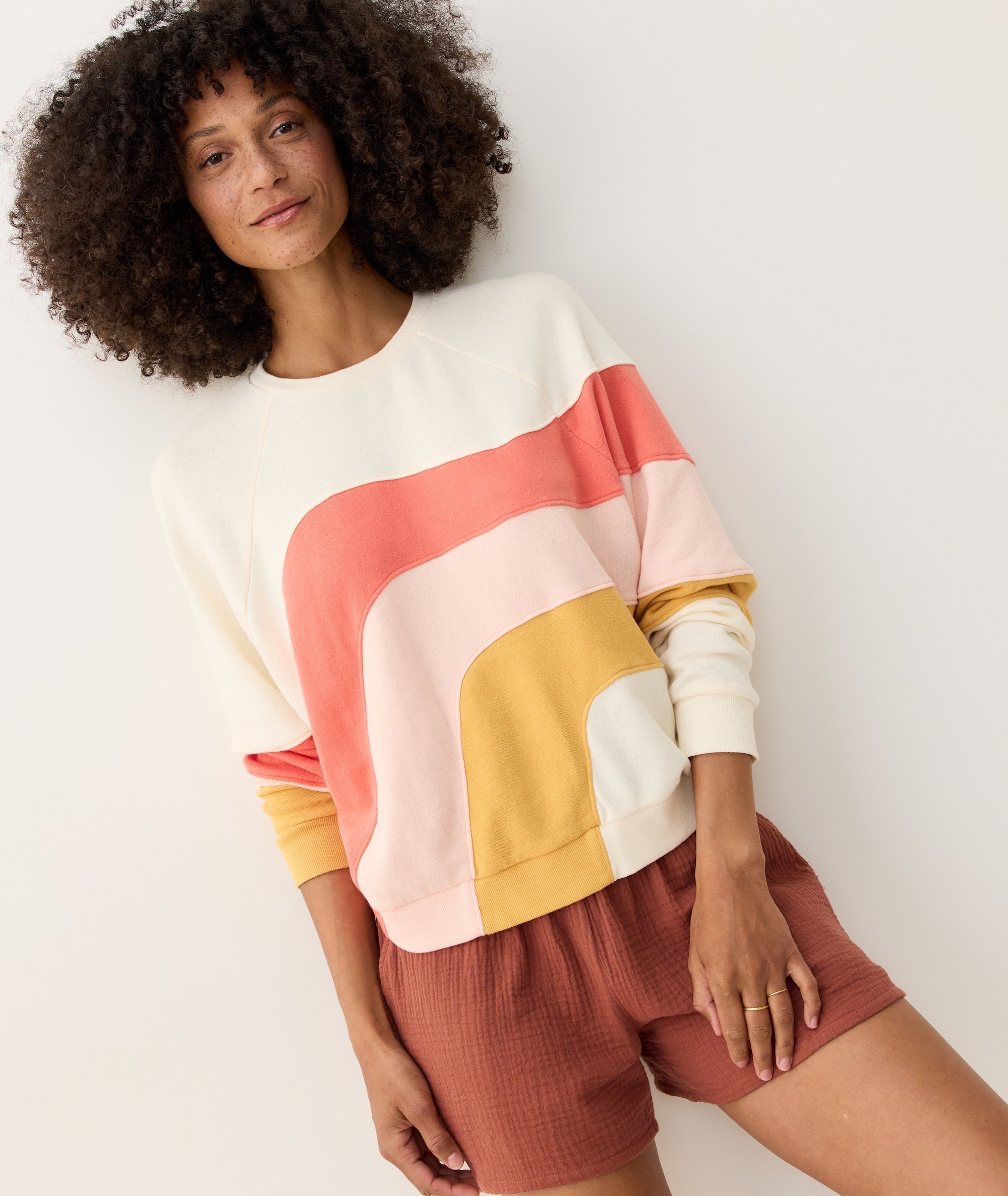 This vintage-inspired, terry sweatshirt belongs in your rotation. You see, it's not just any sweatshirt. With absurdly soft terry lining the entire interior, this style's got a custom appliqué design. We sewed together some of our favorite hues for a unique, vintage-inspired look. Then, we topped it off with raglan sleeves, a soft exterior, and—well...here we are.