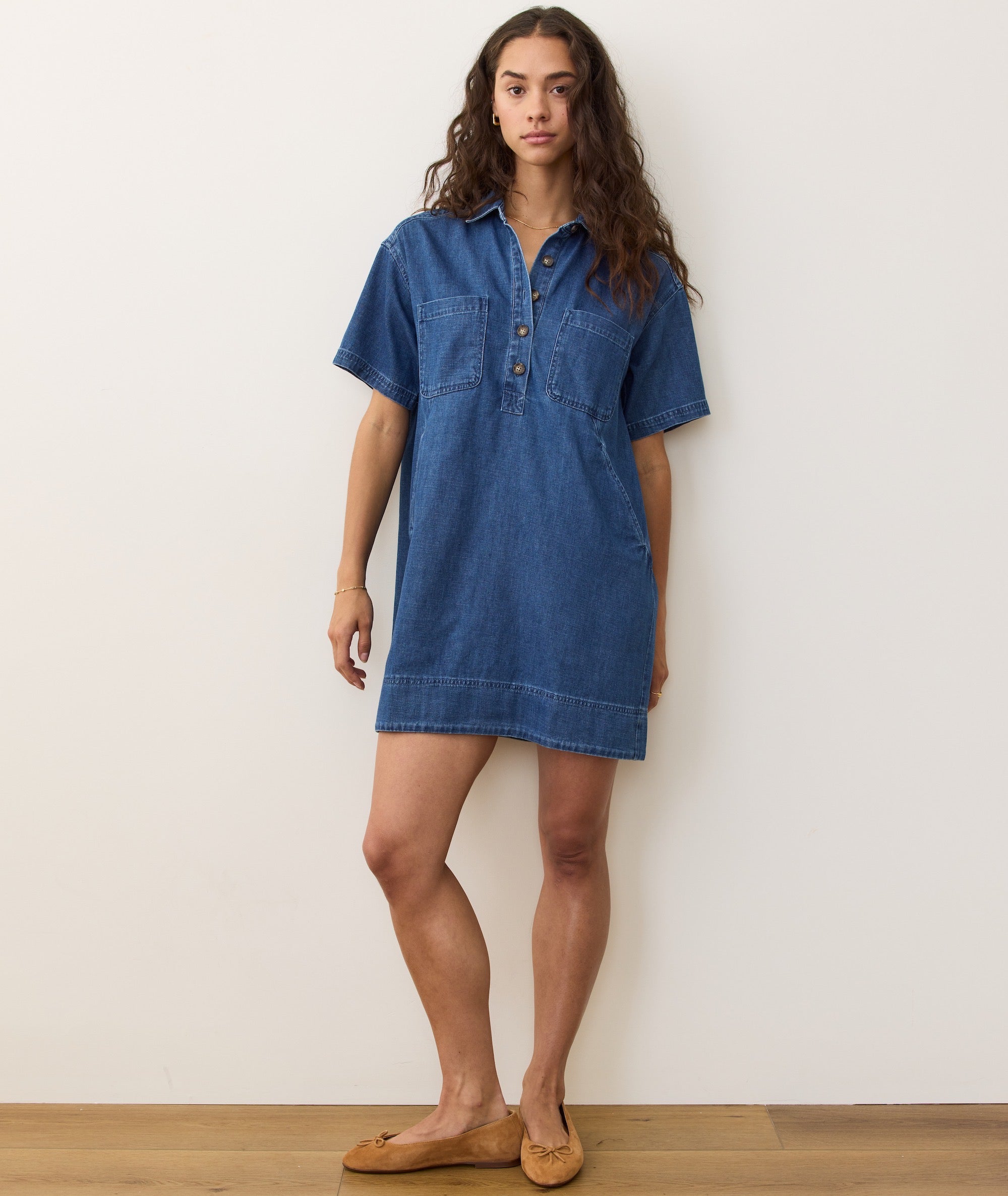 This is the latest dress with our perfectly soft denim: a super simple a-line shift dress with a button-neck and built-in pockets. The kind of mini you can throw on just when you think it’s too cold to wear one. But there you are, looking cute when everyone else is bundled up.