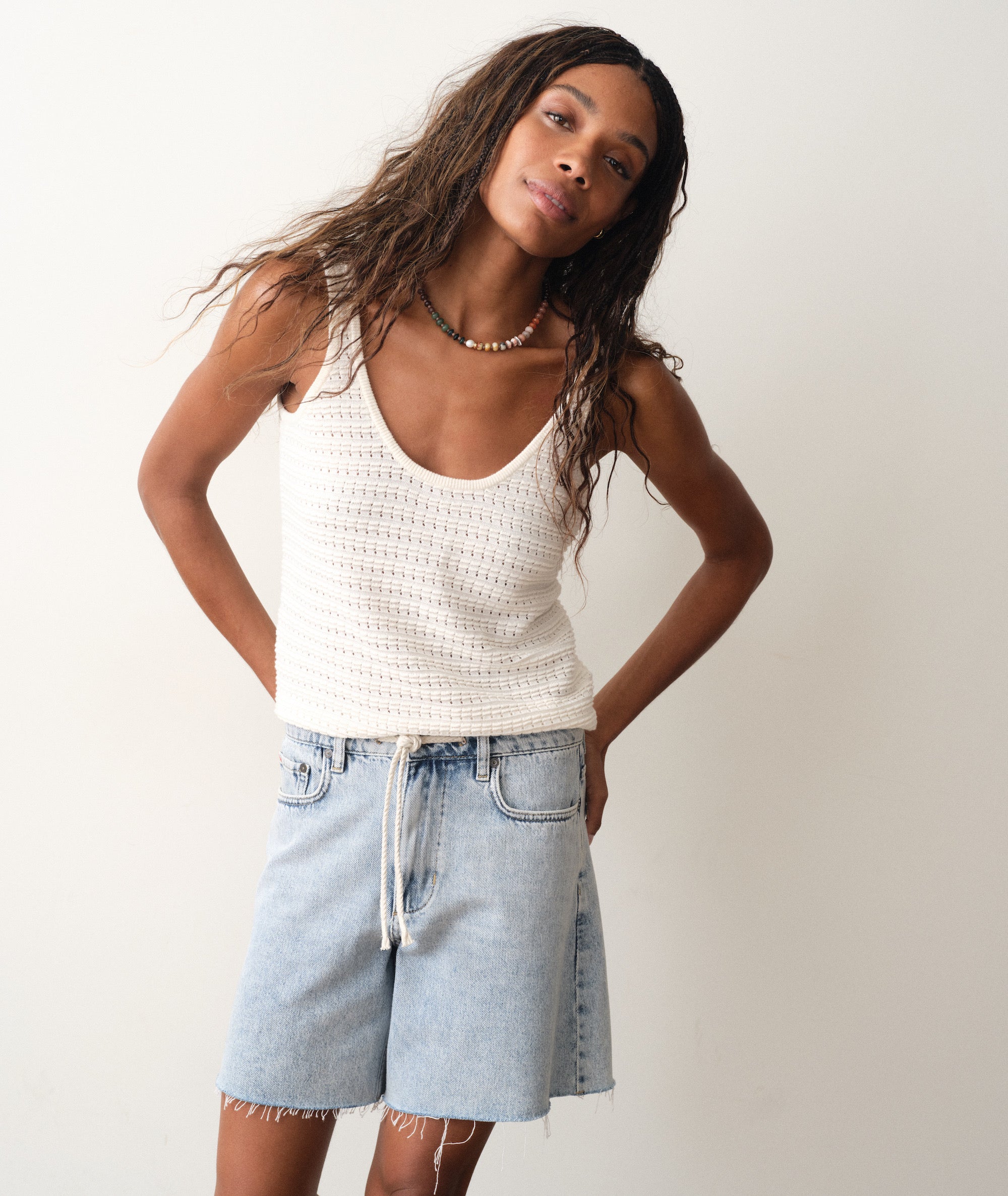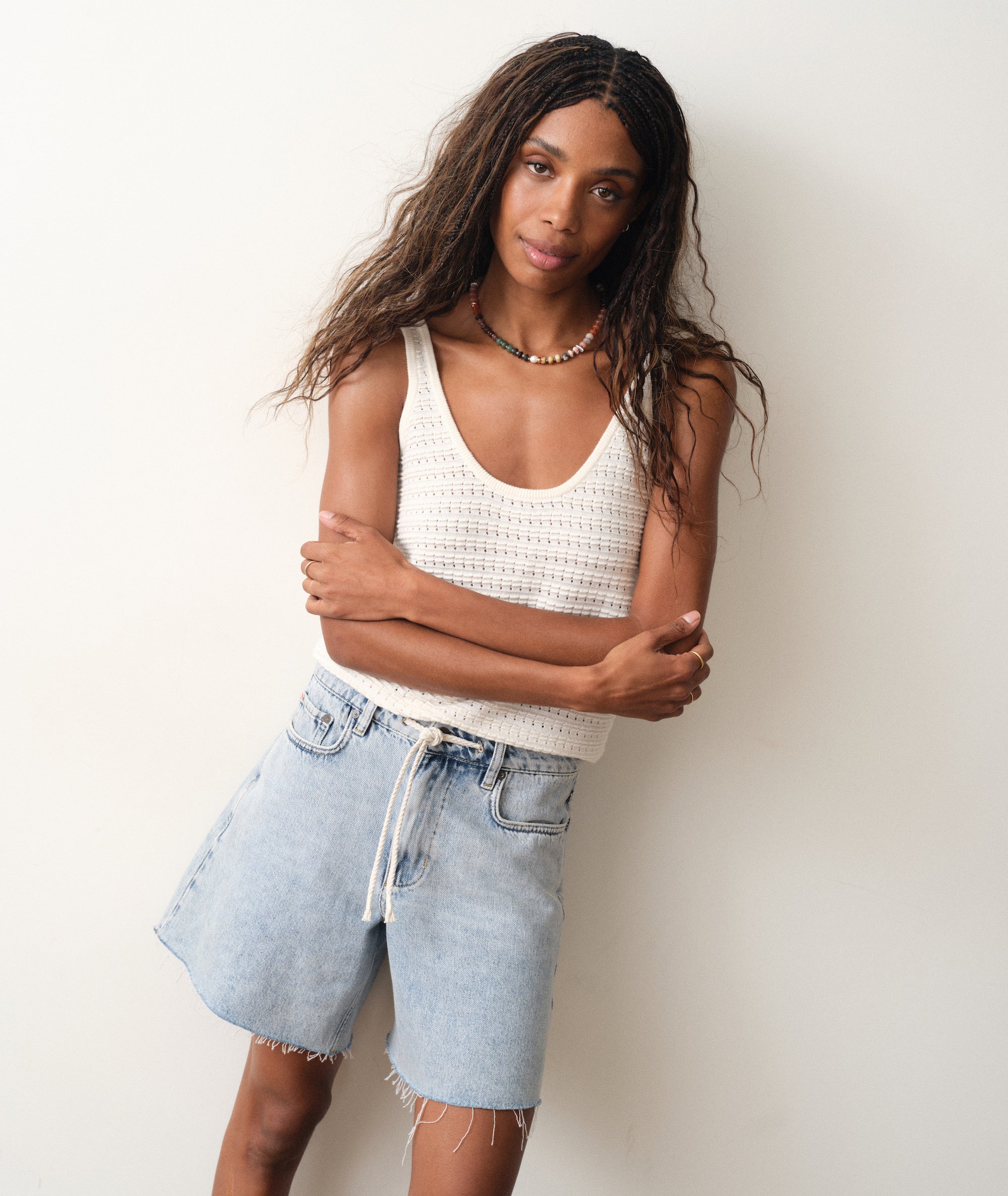 A laid-back double scoop tank, this one hits the sweet spot of casual and chic. We love how the timeless stripe and easy silhouette go with everything, but we especially love it with our Double Cloth or linen bottoms. It's made from 100% cotton to keep you comfy and cool while you're out draining your social battery (or at home recharging).