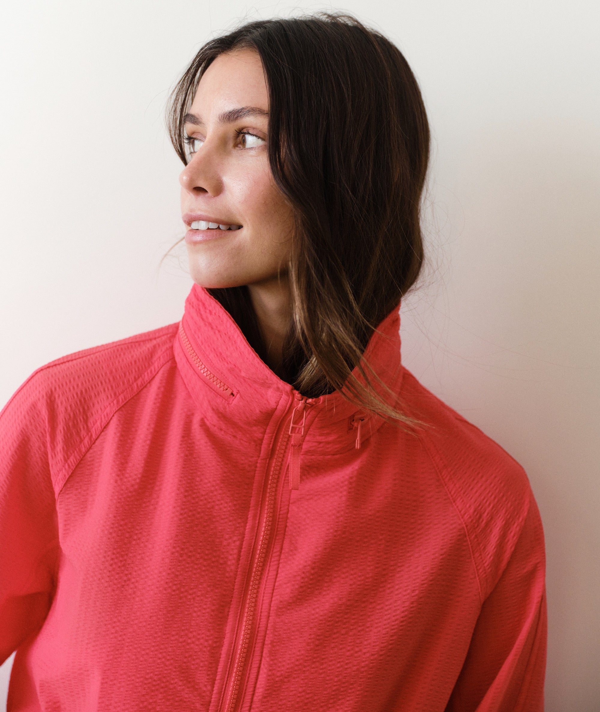 This is our oh-so comfortable take on the classic anorak, in a lighter weight that’s perfect for wearing between seasons. With a super stretchy seersucker fabric, elastic cinches that give it a little shape, and a hood that stows in the collar, it’s a bright and comfy jacket that reminds you warmer days are not far off.