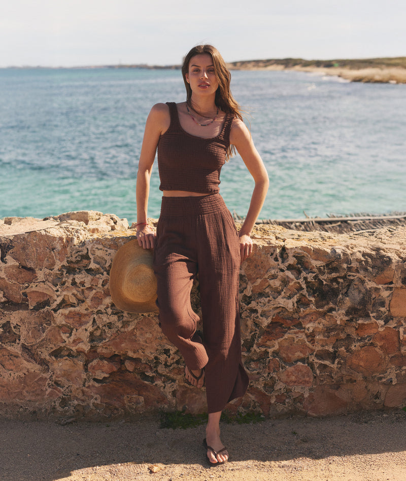 We wanted to create a perfect summer pant that works for the beach, the farmer's market, and everything in between. This style features our bestselling Double Cloth, so it's lightweight and perfectly crinkled, with a smocked waistband to wear high-waisted, or closer to the hip. Throw 'em on over your bikini, favorite ML tee, and boom — your warm-weather uniform is born.