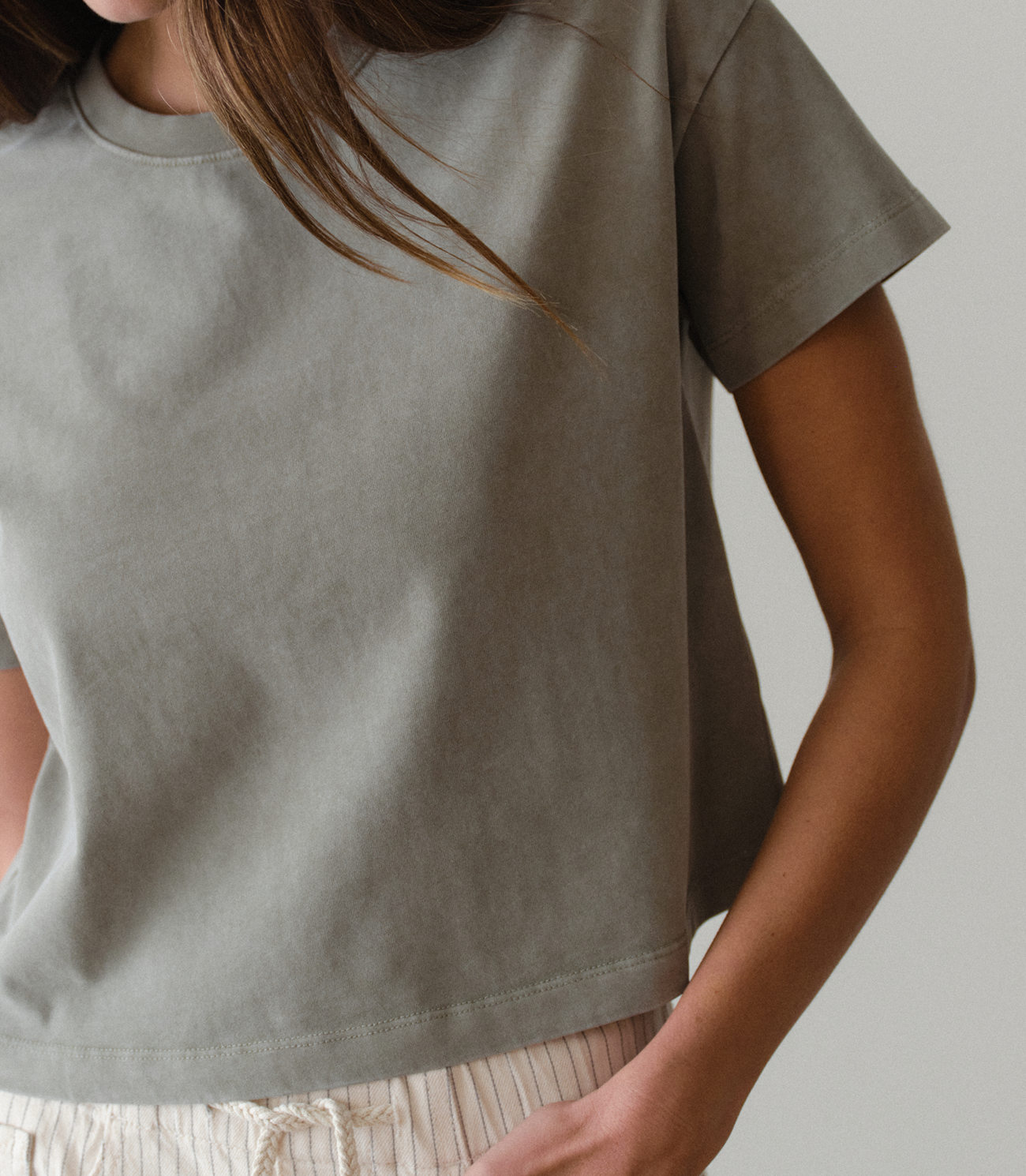 Meet our newest luxurious tee fabric. It has a slightly tighter knit that makes it drape like a dream, and a peached surface with a velvety texture you’ve got to feel to believe.