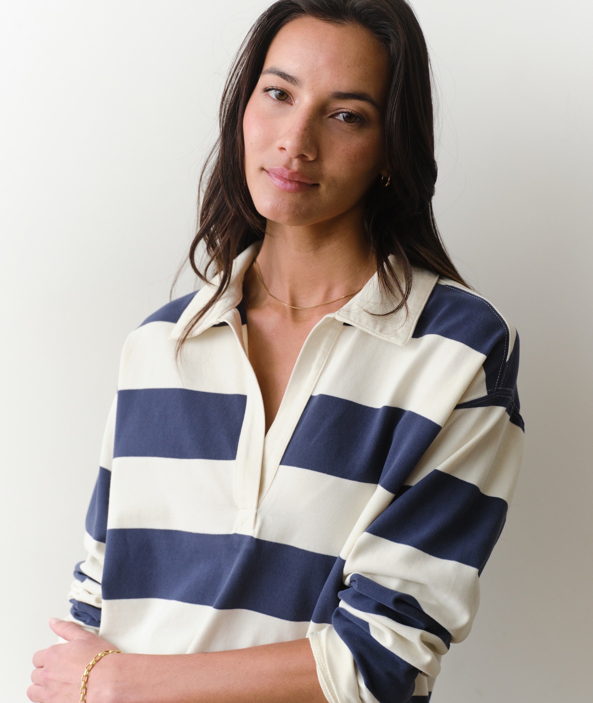 We wanted the look of a classic rugby tee, but with a few more feminine touches. So we created these tees with a deeper V neck and a buttonless placket, an effortless relaxed fit, and a fabric that's amazingly drapey and soft all at the same time. It's put together and laid back all at the same time. Just the way we like it.