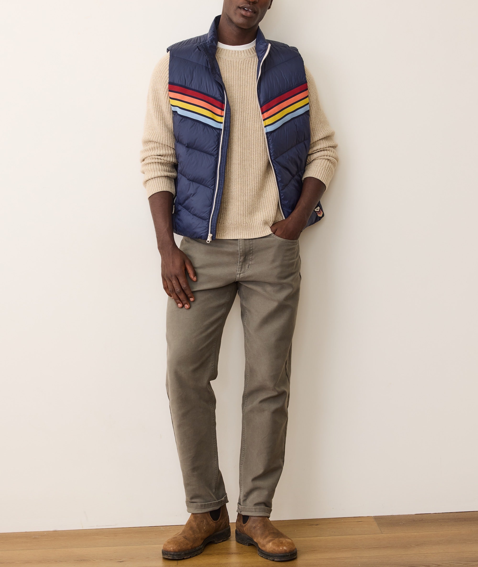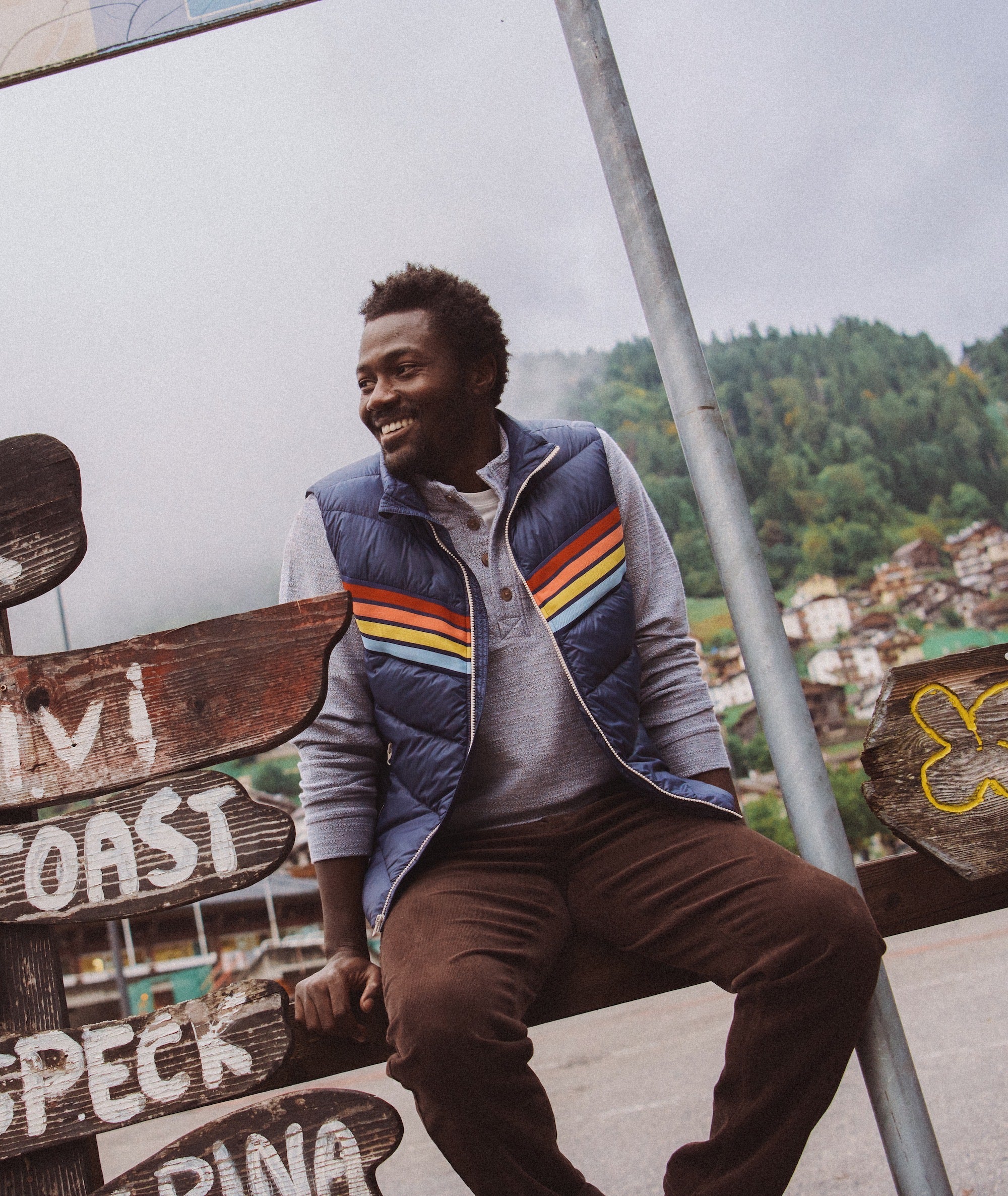 We took the classic 1970s ski vest and gave it some serious upgrades. Now it’s water resistant, and made of 100% recycled nylon.