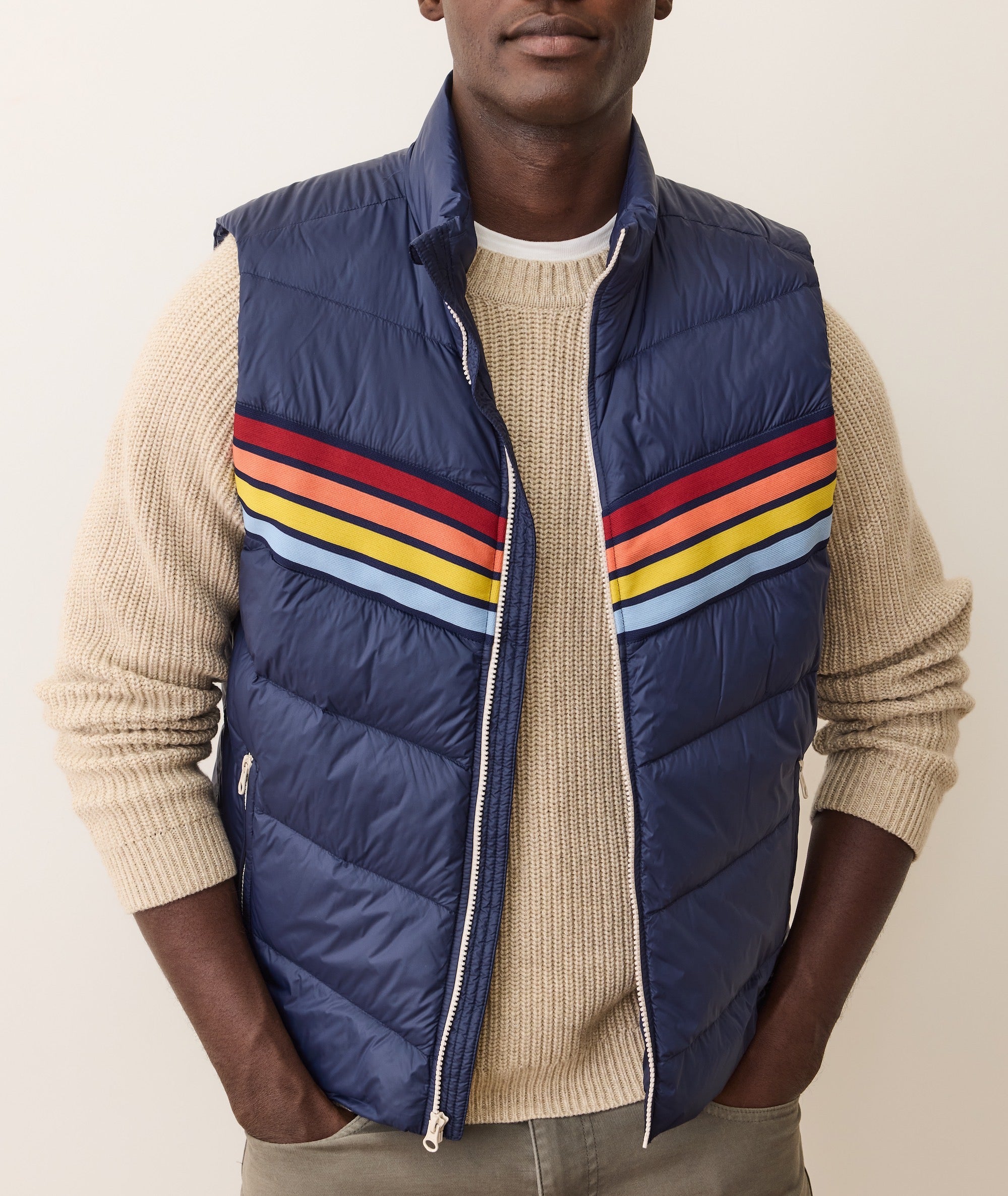 Just because you're doing après indoors, that doesn't mean you should miss out on the vintage style. So we made this 70s-inspired ski vest with a new, ultra stretchy sunset stripe across the chest and, as is traditional for vests, no arms. That means it's warm enough to run outside and turn on the hot tub, but not so warm you have to take off when you come back indoors. Just don't keep wearing it when you get in the hot tub, okay?