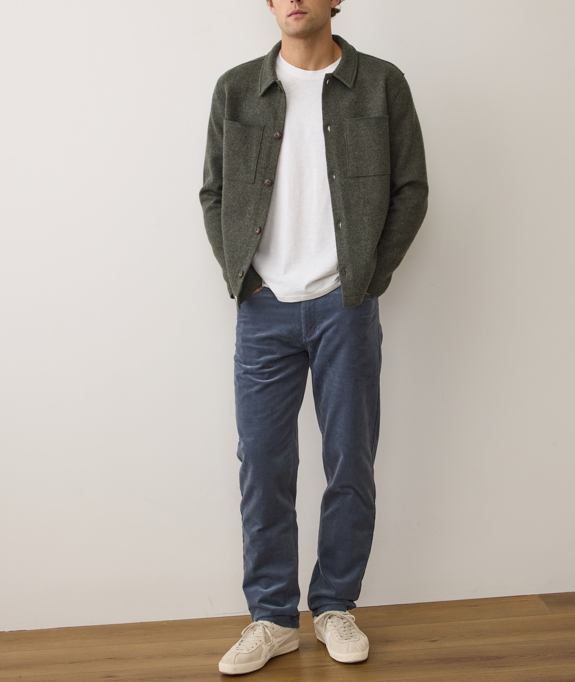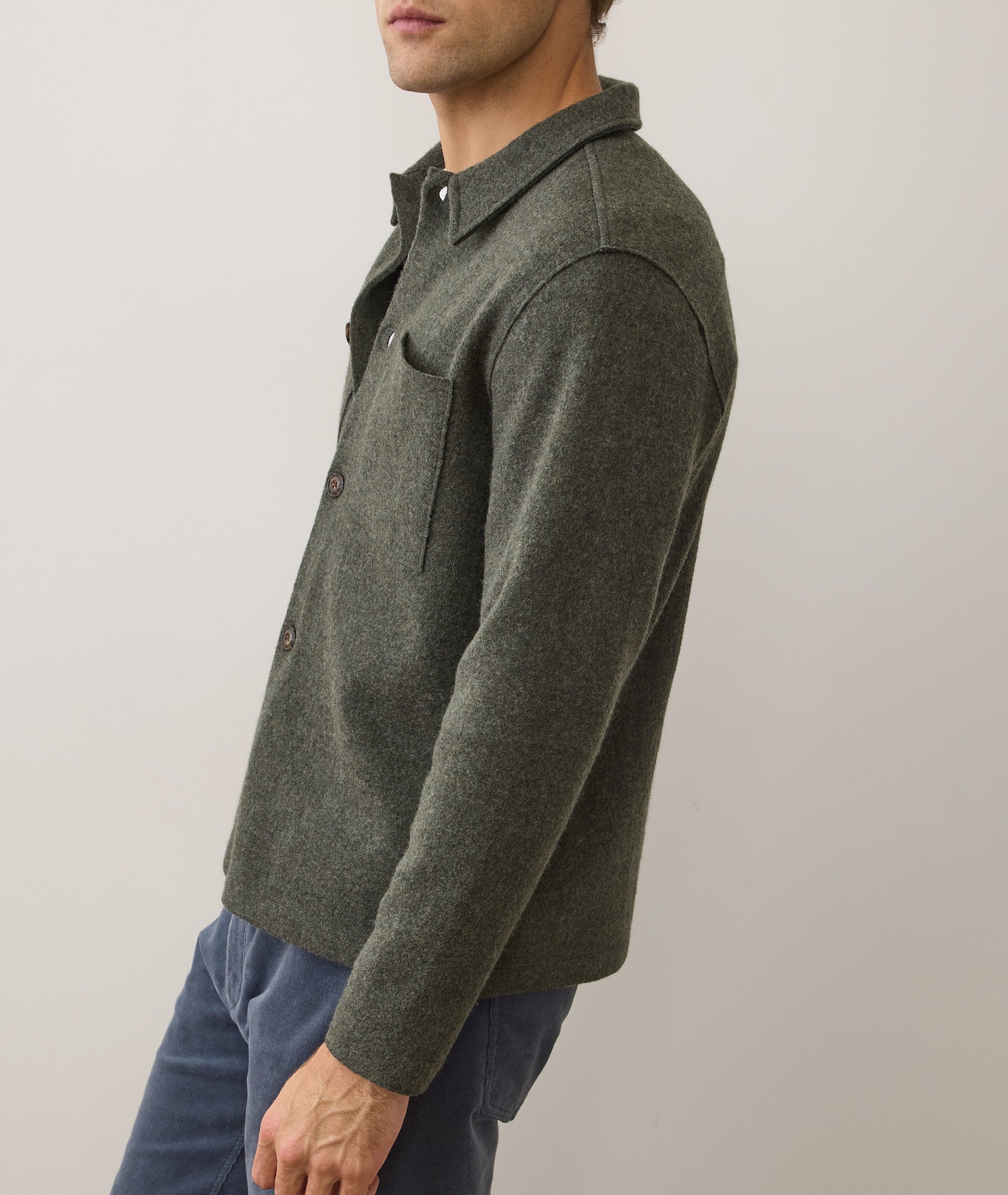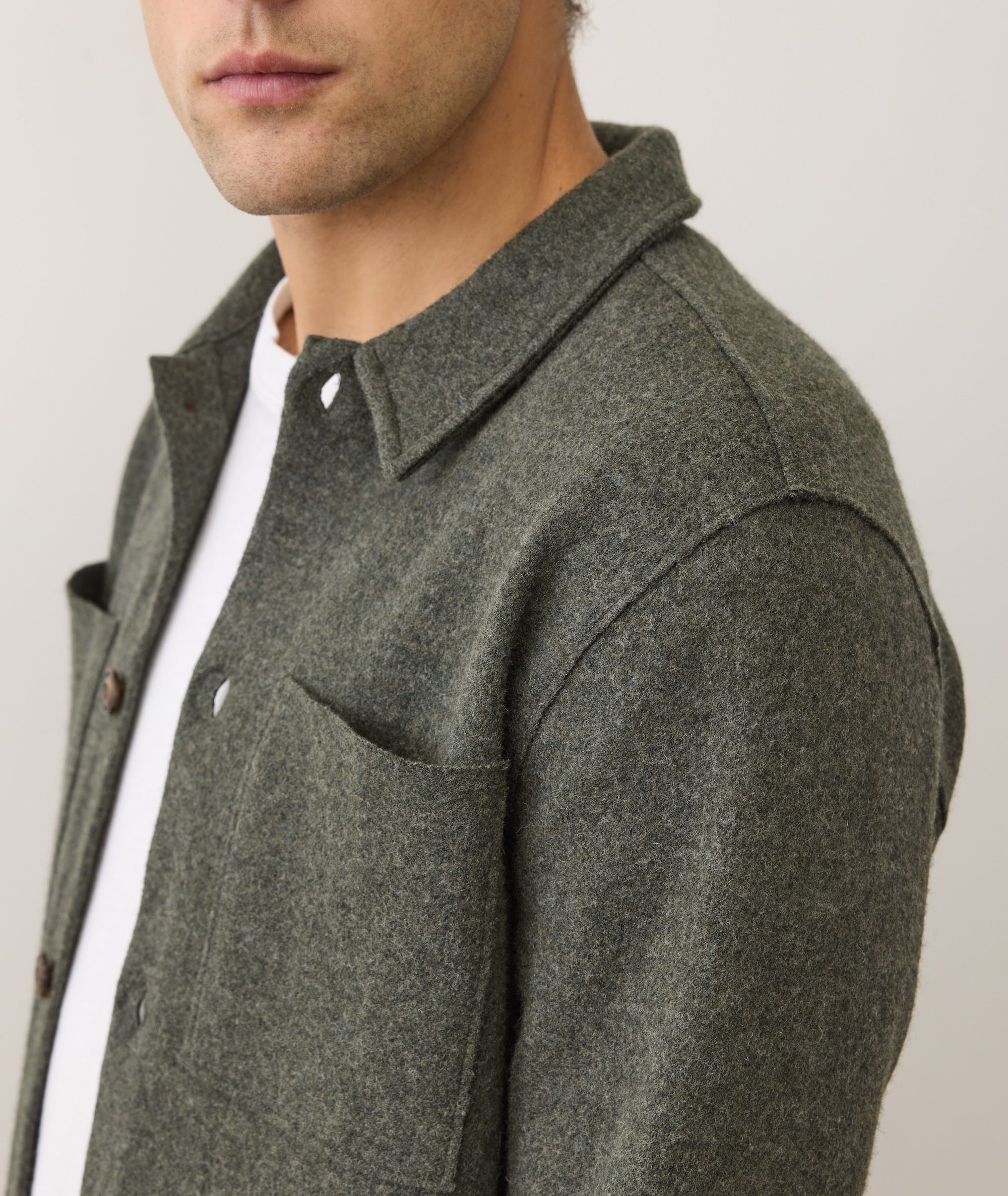 This overshirt is made with a soft but sturdy 320 GSM wool that's been boiled to bring the fibers closer together. That means you get the warmth of a thicker fabric, with a more compact look. Science is cool, right?