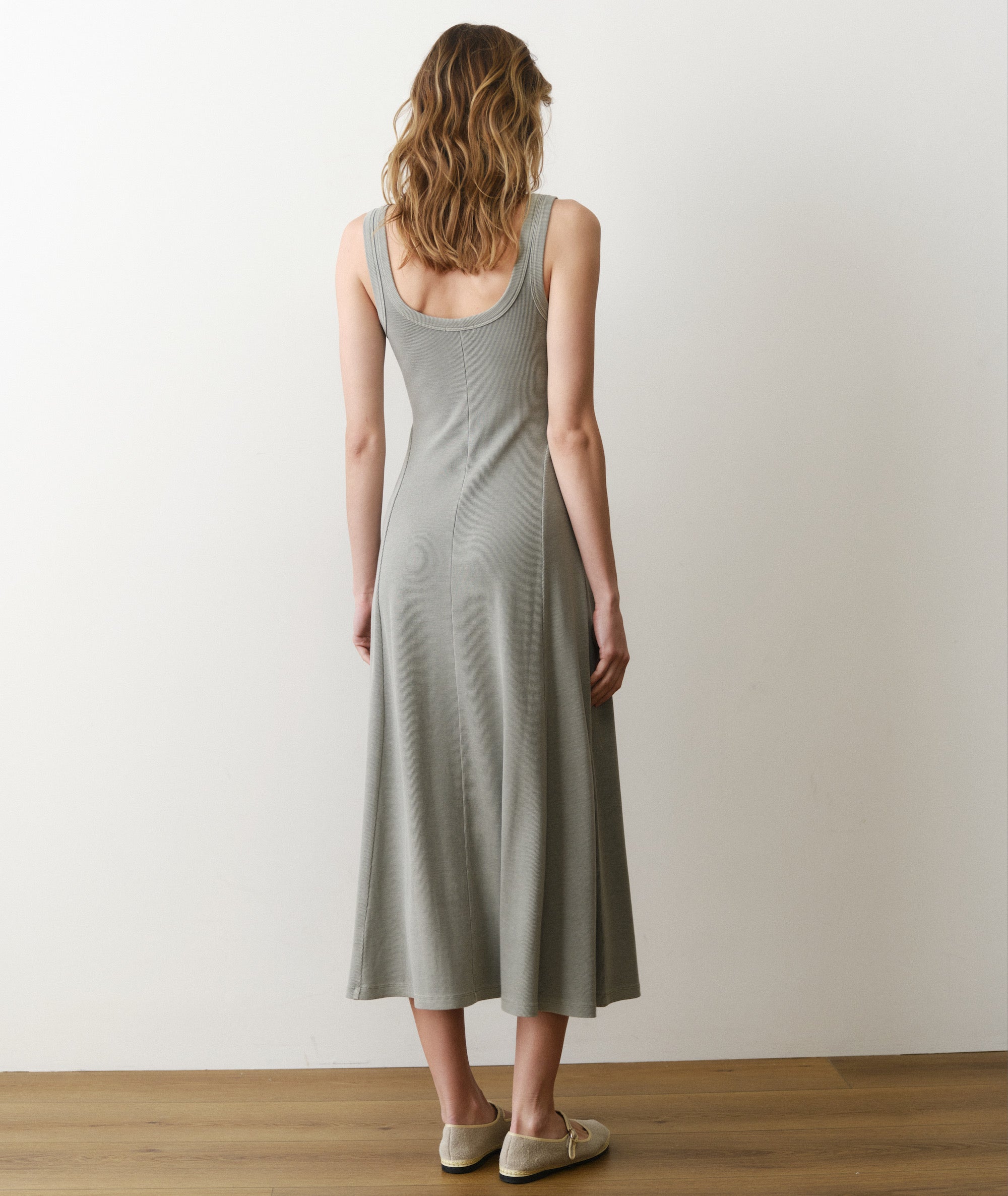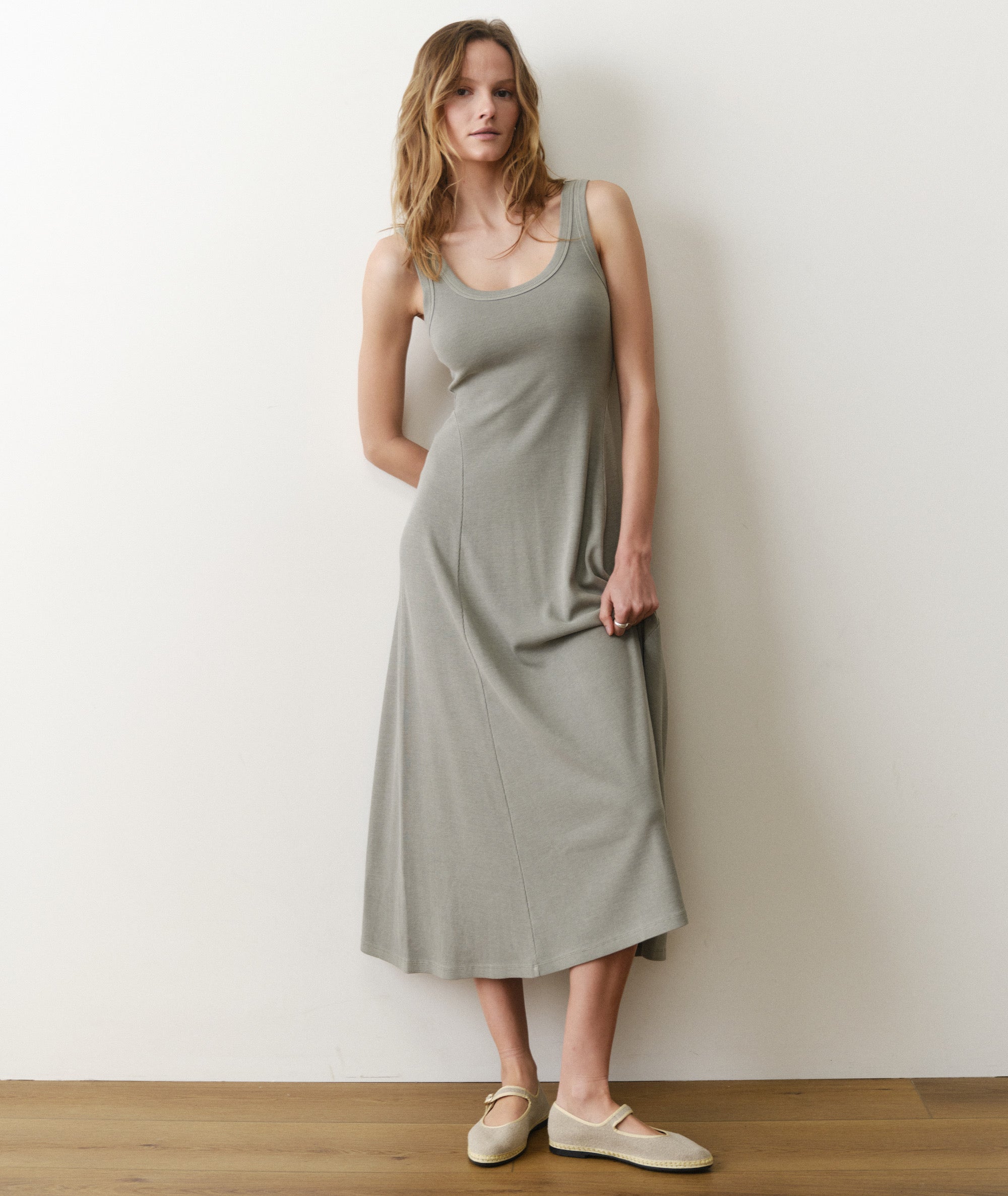 The dress that does it all. We've added godets to give it an extra dose of flow, making it even more elevated and breezy. The top is lined and fitted, while the bottom flares out for a perfectly swingy, summery vibe. With a maxi-length, insanely soft texture, and effortlessly chic fit—this is the dress you didn't know you needed, but you definitely do.