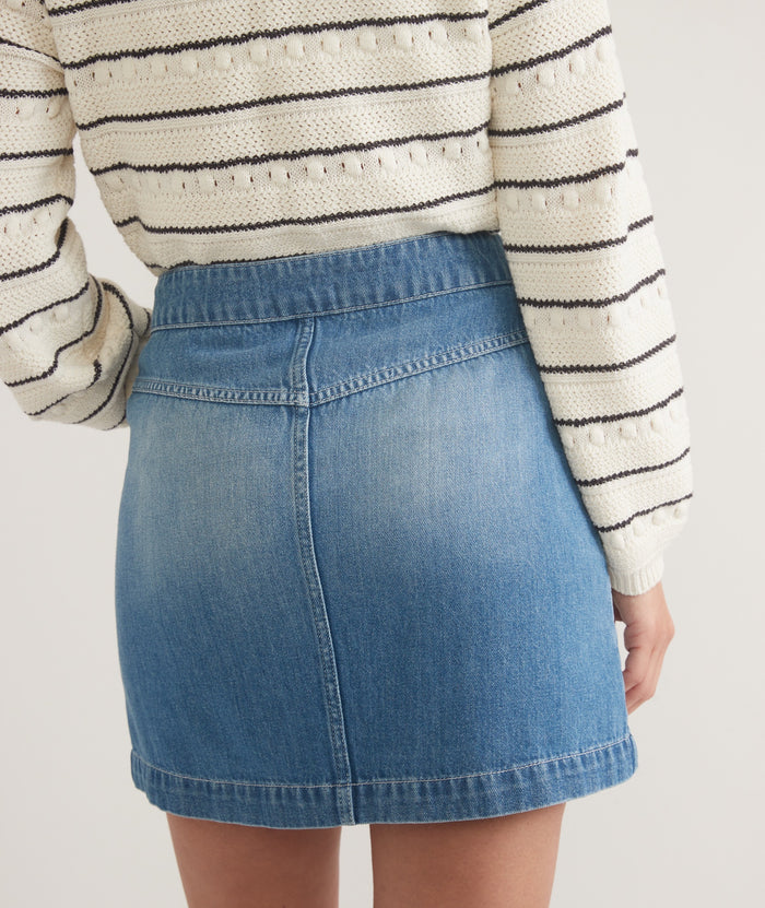 We wanted to create a comfortable, versatile skirt you can wear all year long, and we did just that. This denim mini skirt features a high waist, a-line fit, pockets, and functional buttons all the way down. It's perfect with tanks and tees in the summer, or sweaters and boots when it's cold out. Told ya, it works anytime.