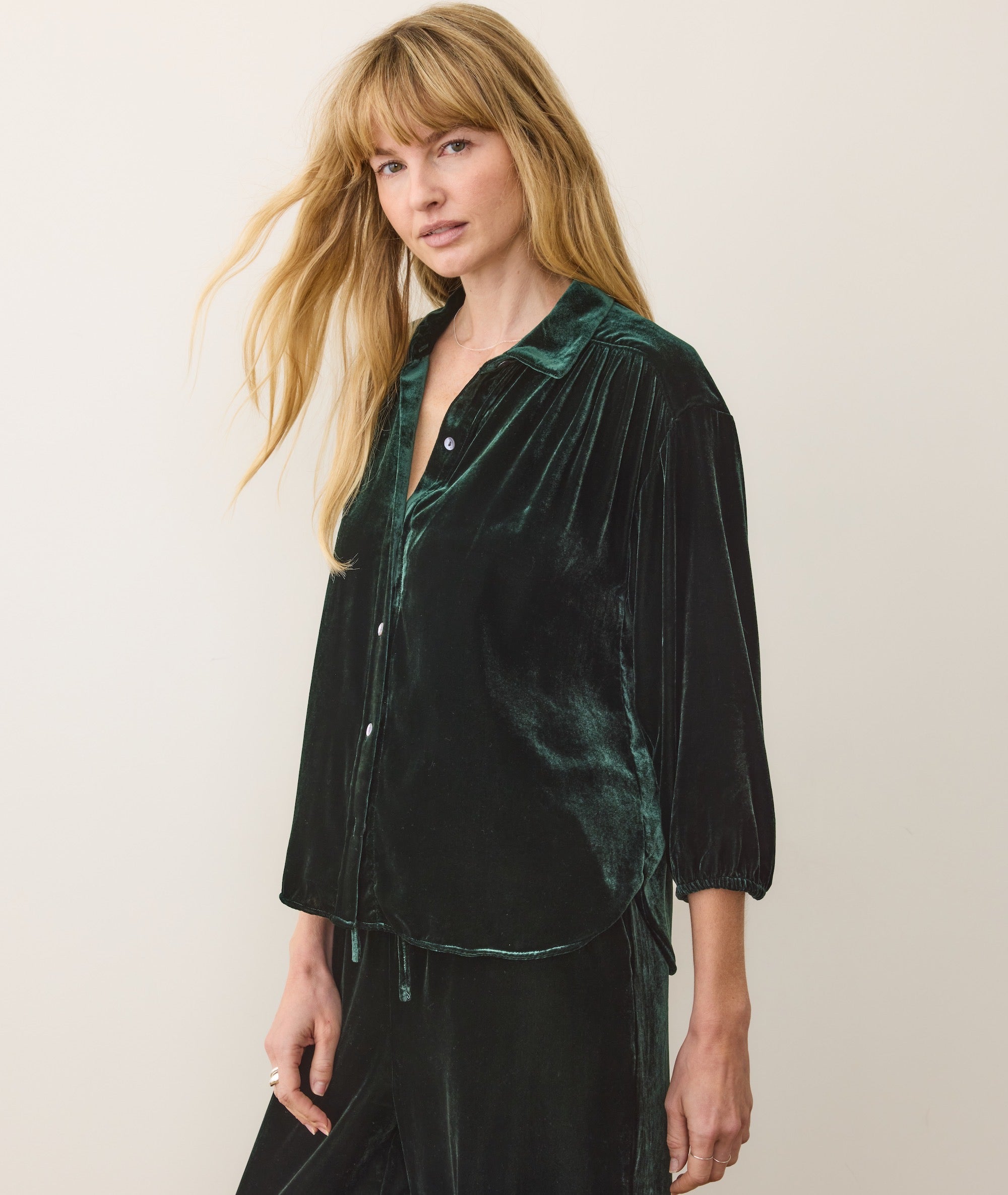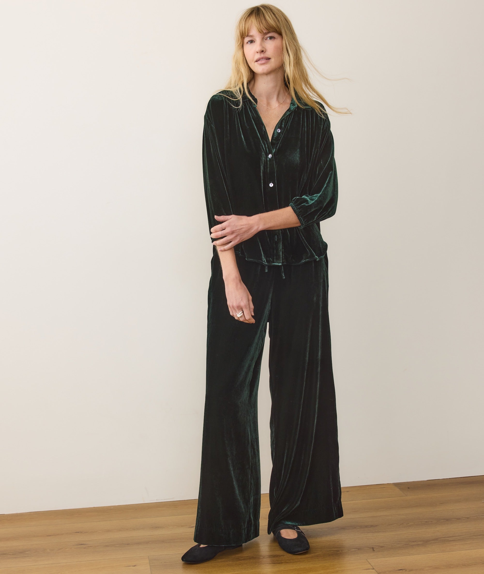 We wanted something that felt special for all those holiday dinners, cocktail parties, and steamy chalet getaways. So we made this incredibly soft, flowy velvet button down that feels luxurious but lightweight, and full of classy festivity. And if you wear it with the matching drawstring pant? Well let's just say we know who's winning the holidays.