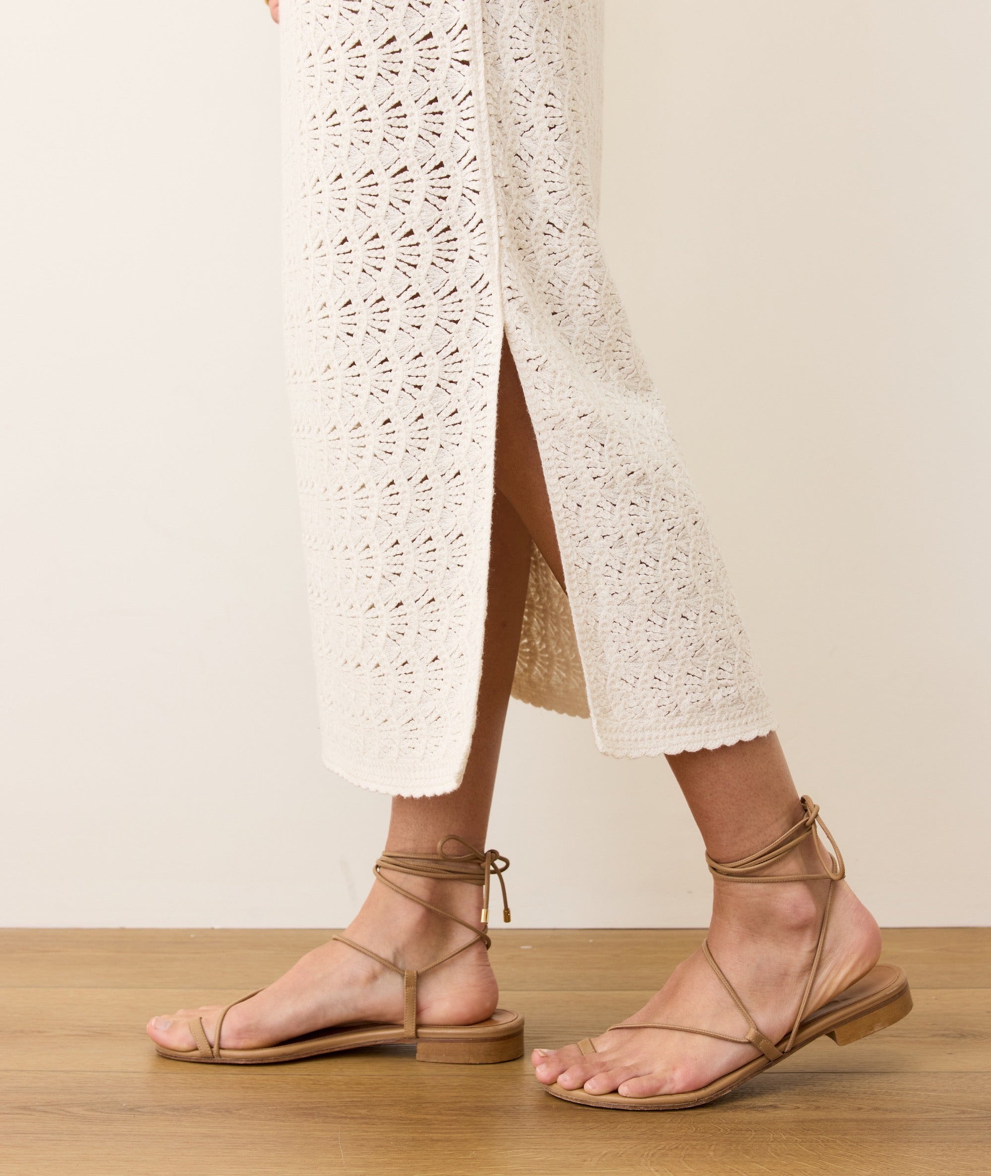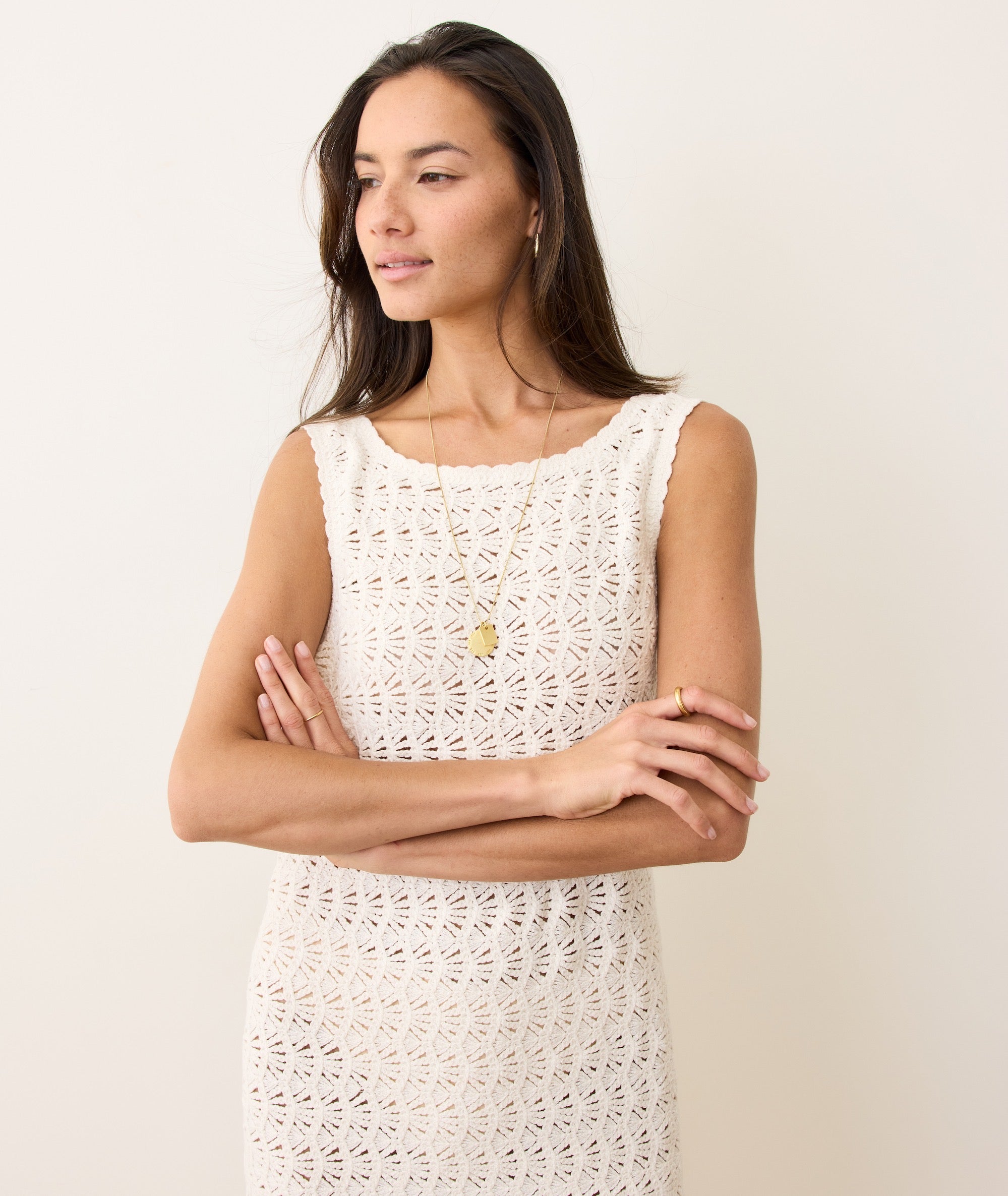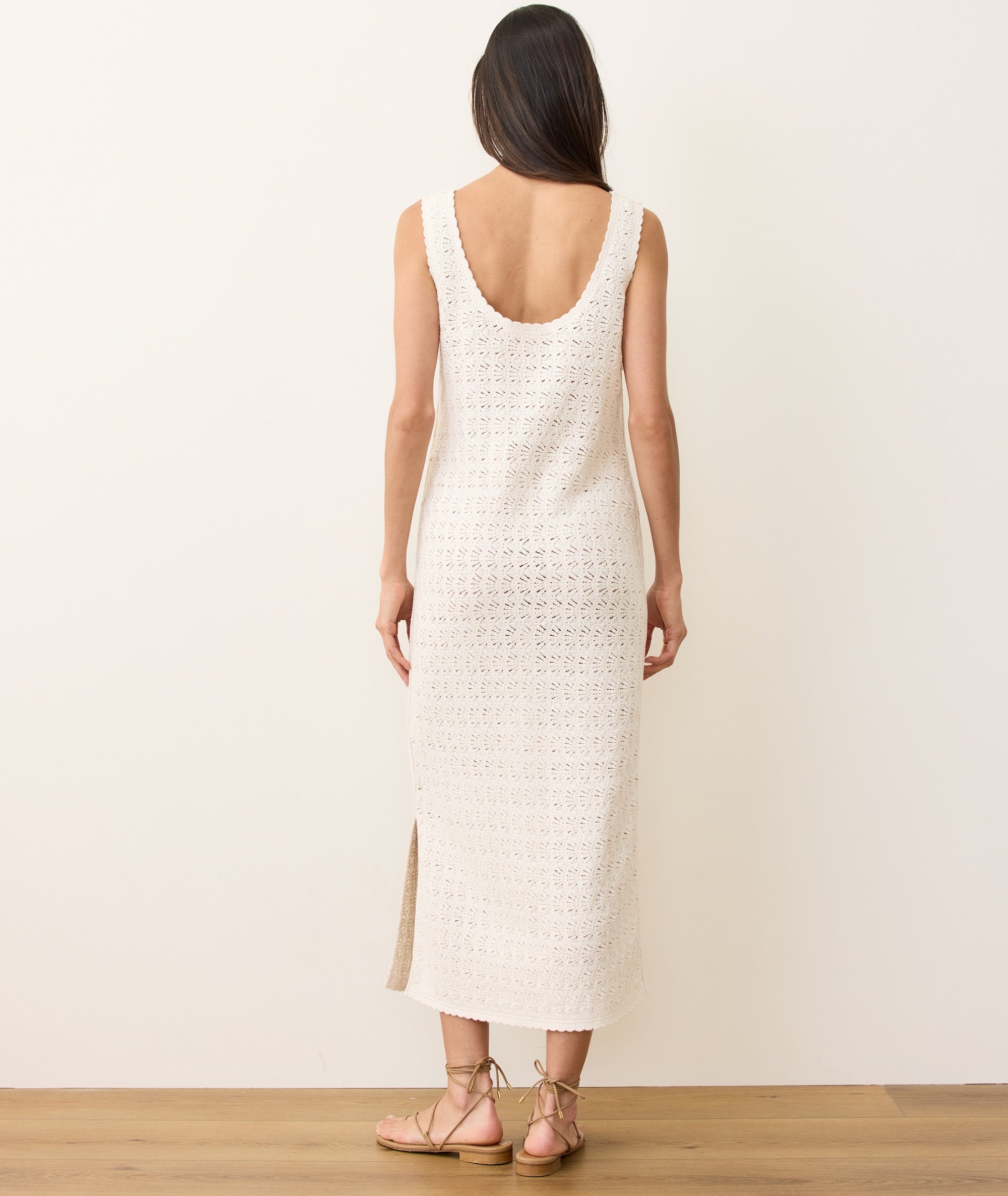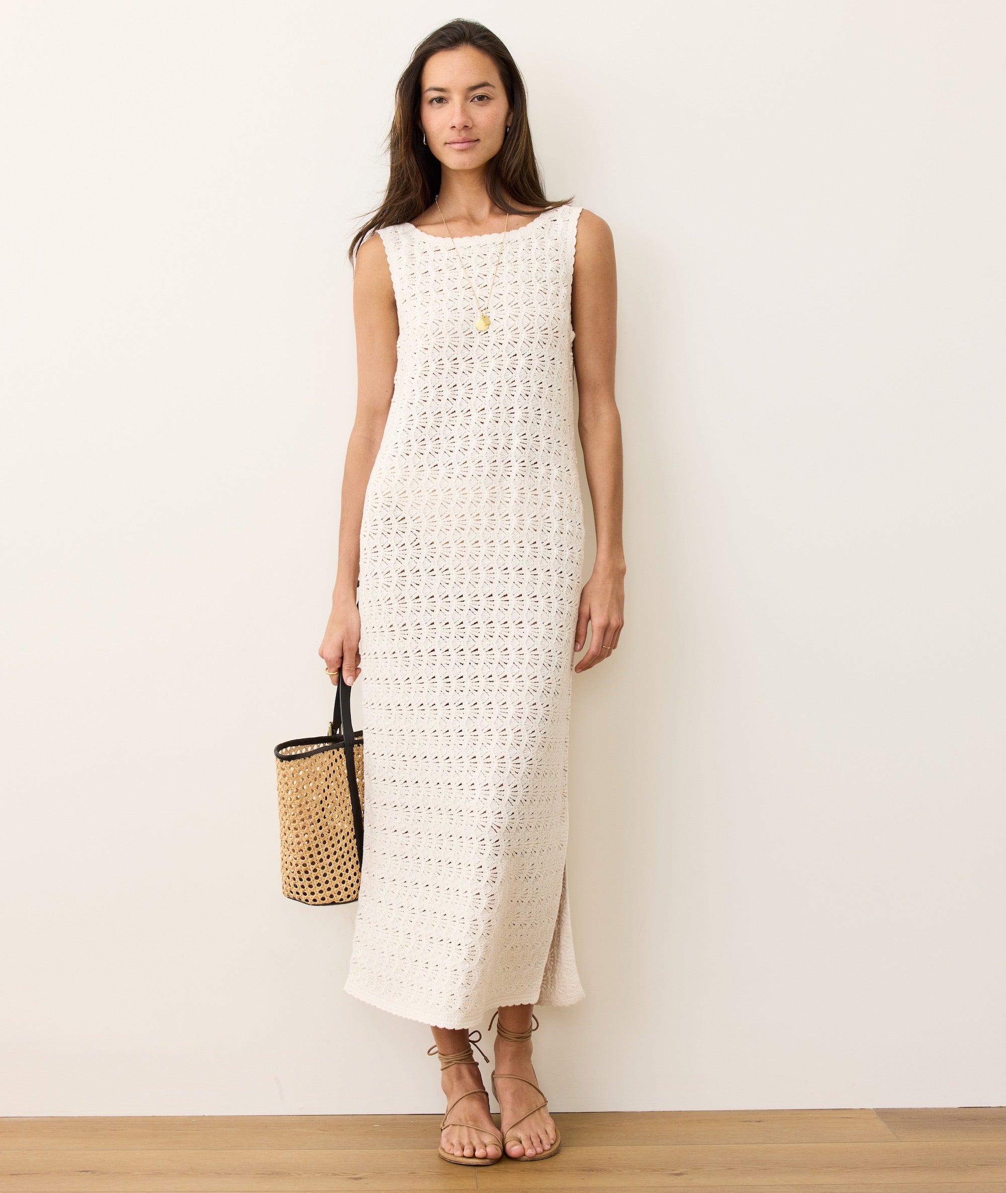 This airy column dress is made from our crochet shell stitch. It’s got a breezy boat neck, a scooped low back, and a midi length that works barefoot at the beach or dressed up for a summer soirée. Just add sandals, it's that simple.