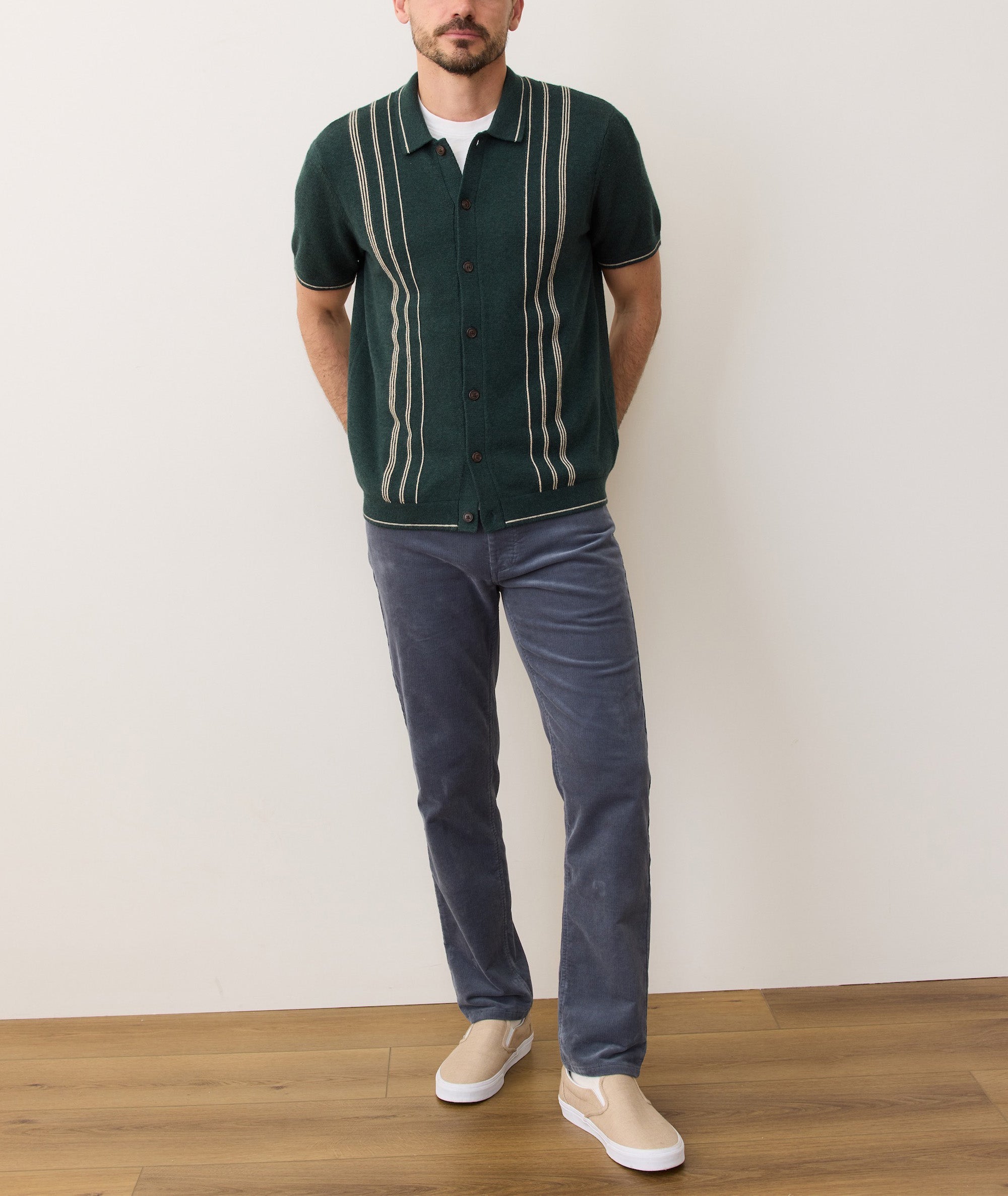 This is the buttery softness of all our sweaters in a new, easy-wearing button down style. With a smooth feel and a placed stripe, wear it with chinos to class it up a bit, or a tank unbuttoned if you’re feeling poolside vibes. Better yet, why not do both.
