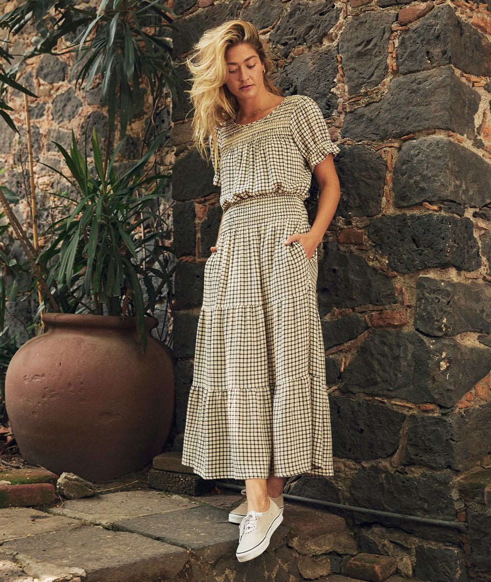 If you weren't a skirt person before, you're about to be one. This new maxi skirt has a super comfortable smocked waistband, soft fabric, and versatile print. Be prepared to wear it all Fall long. There's also a matching top, if that's your kinda thing (!)