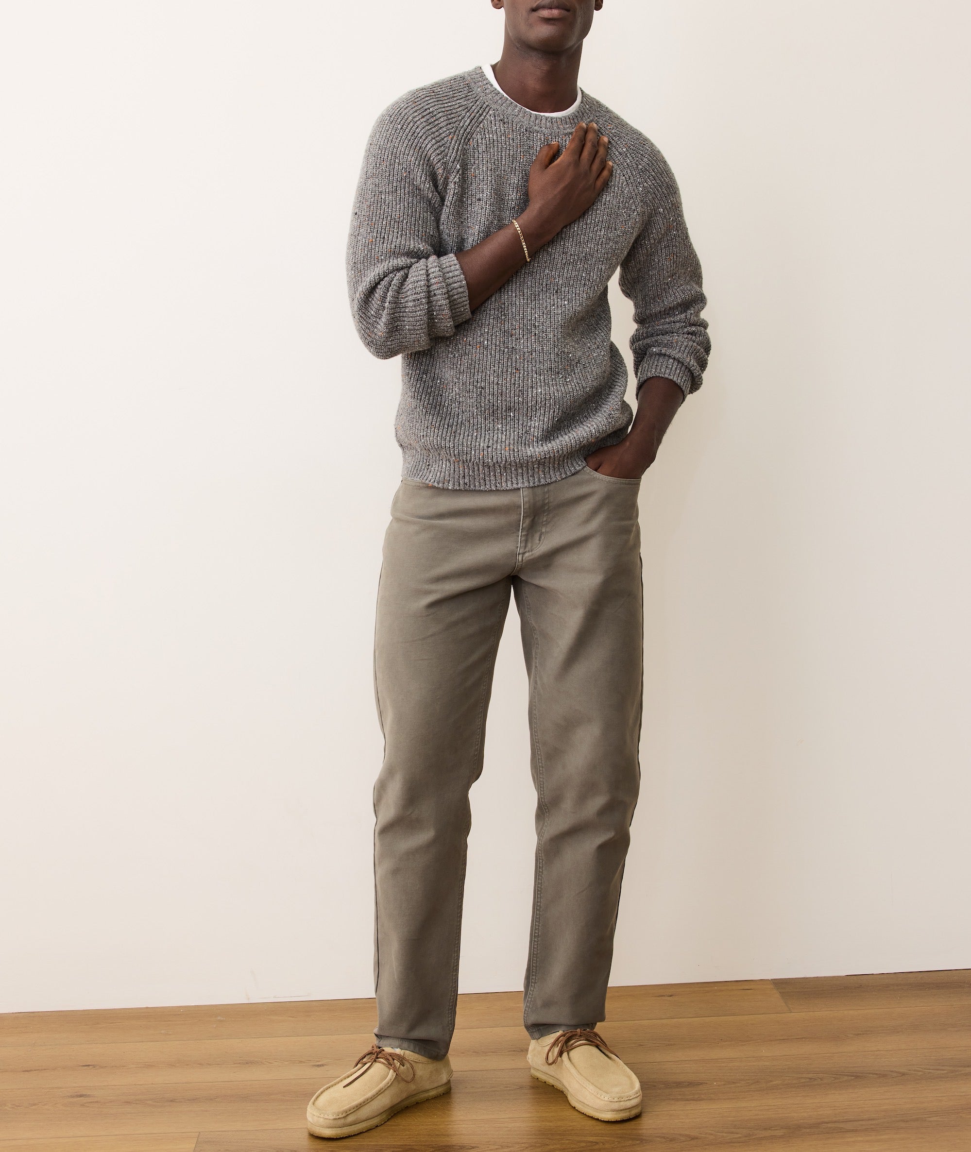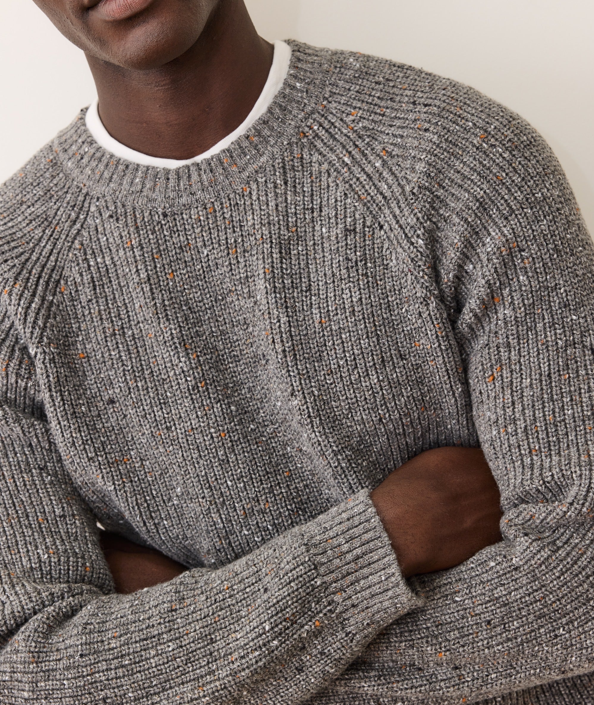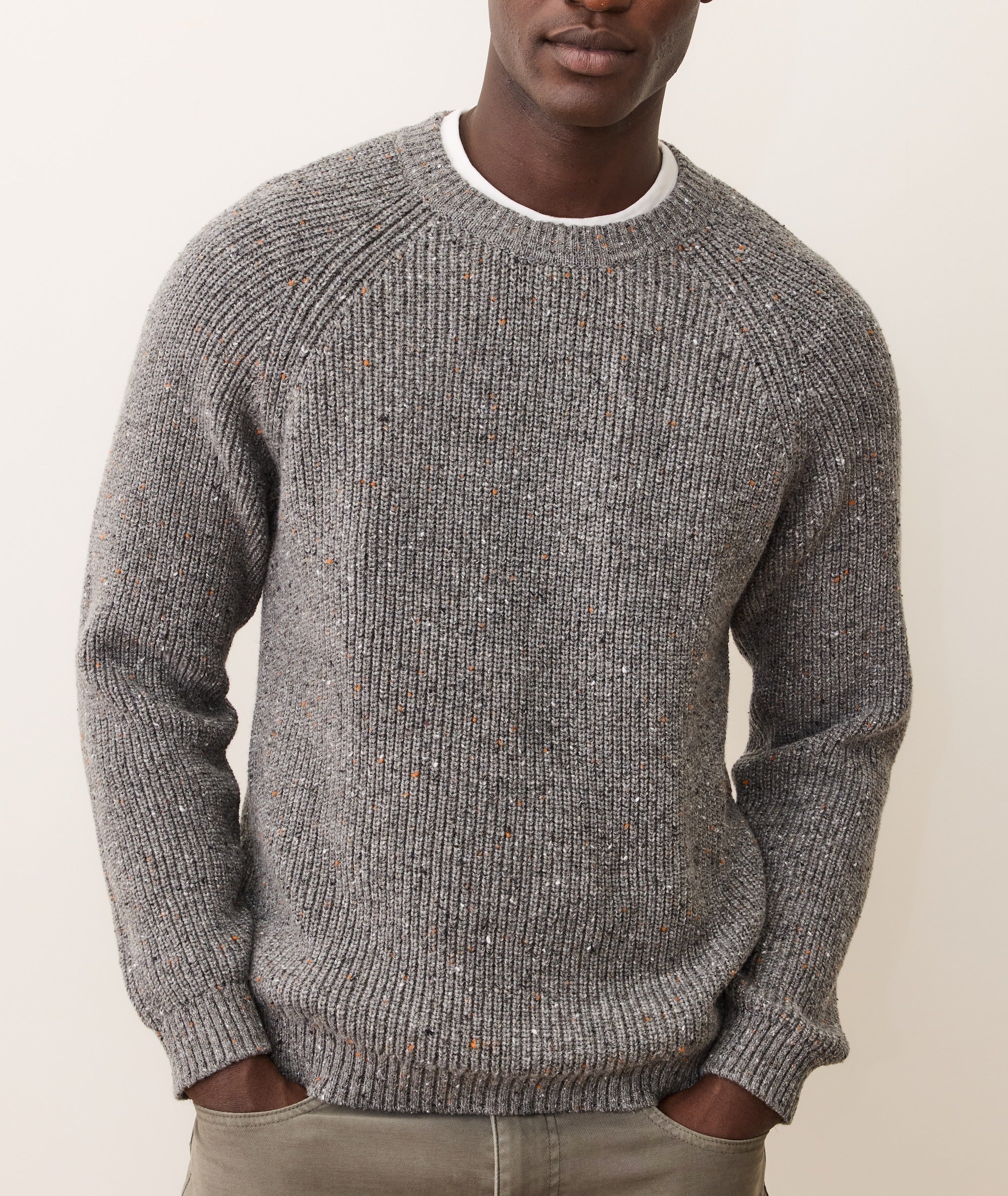 "Our Inverness sweaters are perfectly weighted, warm, and the ideal middle ground between a pattern and a solid. They get their unique look from a yarn that has bits of color twisted into the strands, giving the knit its signature visual texture. Sorry, were we nerding out on yarn for a second? We blacked out. Basically: it's a really nice sweater. This Inverness knit is textured and soft-to-the-touch, and has some genuine weight to it. It's warm, comfortable, and can stand up to more rugged styling. 60% cotton, 30% nylon, 10% Merino wool Classic fit Machine wash cold, lay flat to dry Made responsibly in China"