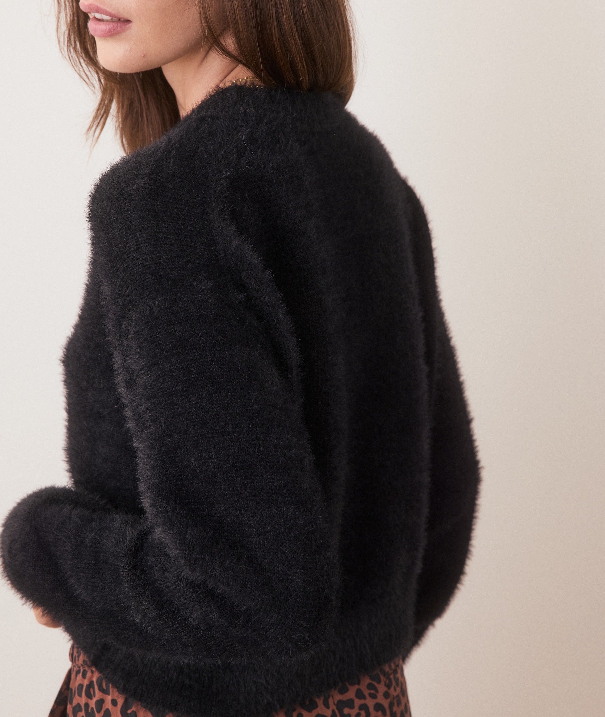 New style alert (!) Created from soft eyelash yarn, this slightly cropped style brings a touch of shine and luxury without compromising on comfort. It's versatile enough to pair with high-waisted jeans for a casual outing or dress it up with a skirt for a night out. It does it all, honestly.