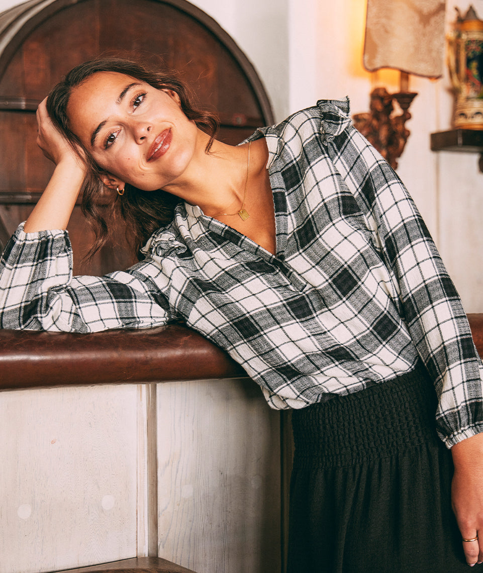 A classic holiday shirt, but make it ML. This style is incredibly soft, with a cozy (yet drapey) fabric and delicate ruffle details. Throw it on with some jeans and boots and call it a day.