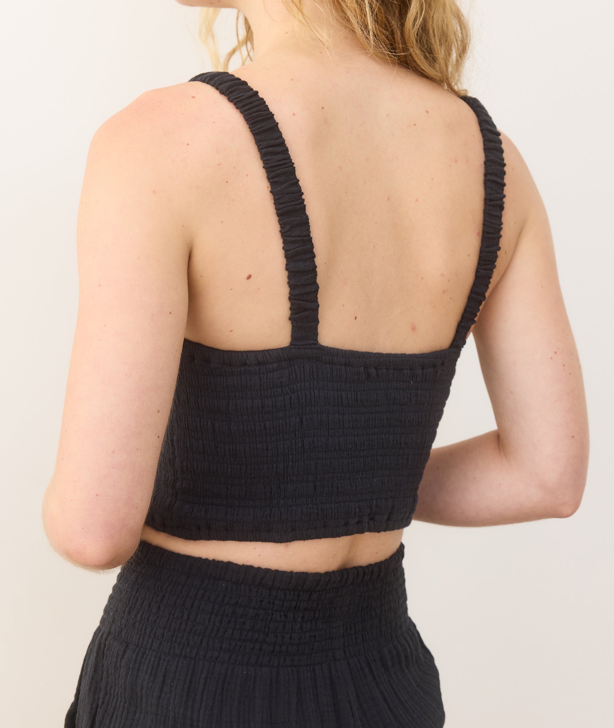 Meet the newest member of our Double Cloth crew. This new top features a smocked bodice, cropped length, and two versatile hues. The best part? It pairs perfectly with our Double Cloth skirts and pants (if you're into that sort of thing).
