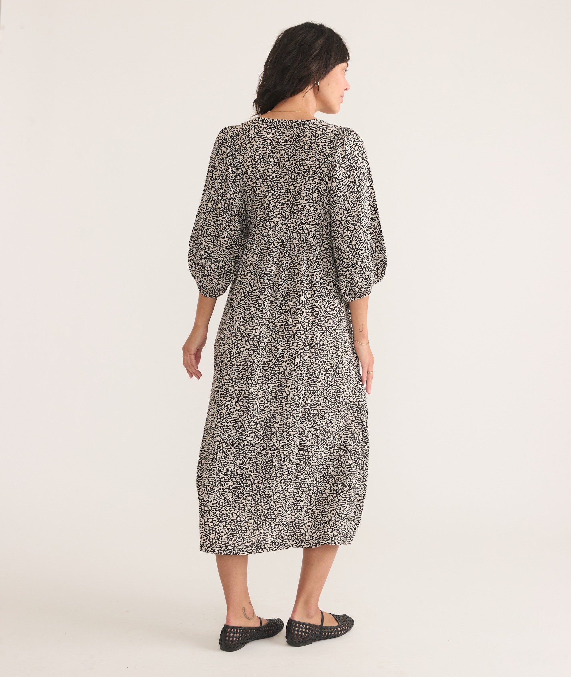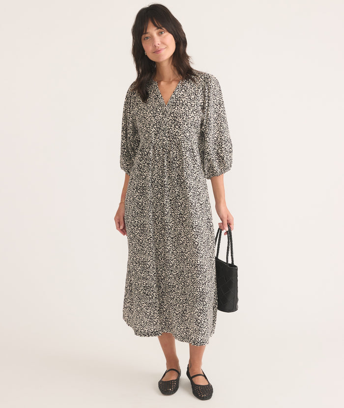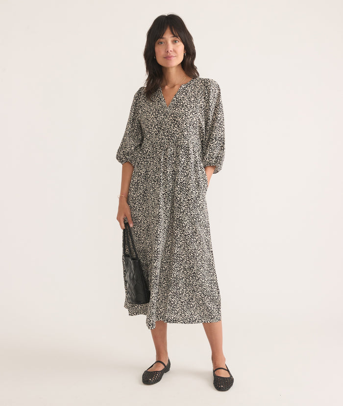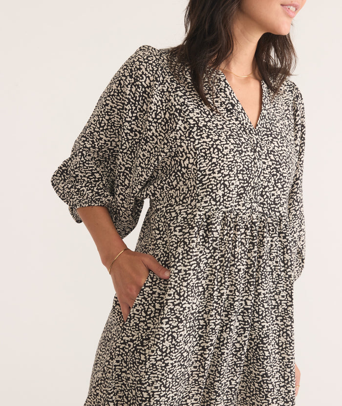 Throw on this easy, bohemian dress, some boots or sneakers, and hit the town. This dress features a v-neck placket, subtle balloon sleeves, and pockets (!)