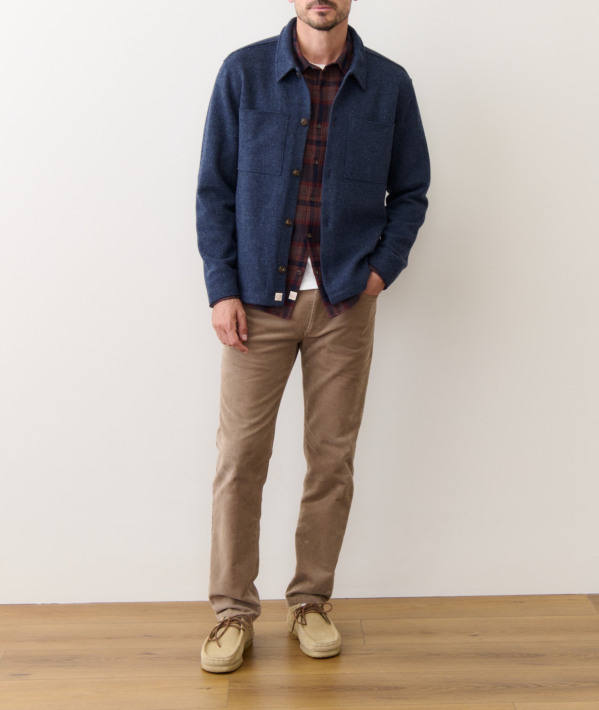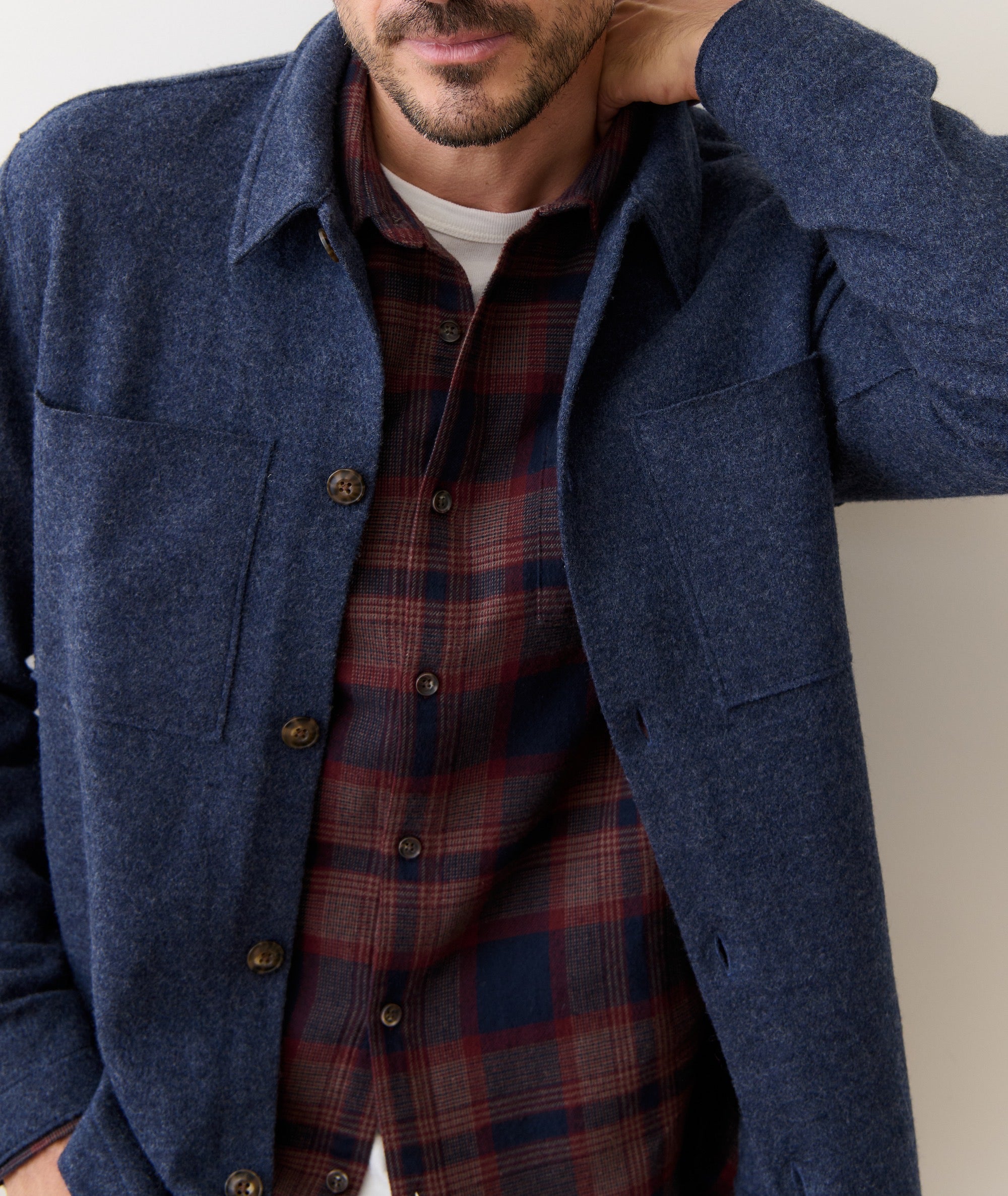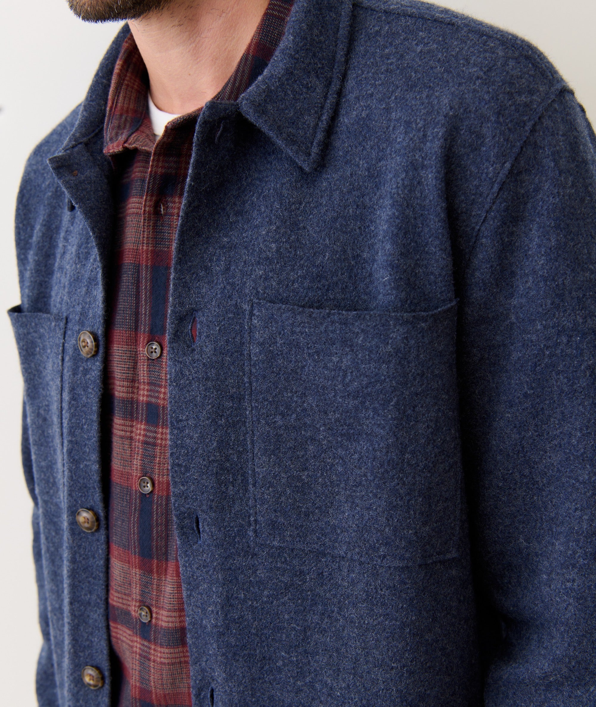 This overshirt is made with a soft but sturdy 320 GSM wool that's been boiled to bring the fibers closer together. That means you get the warmth of a thicker fabric, with a more compact look. Science is cool, right?
