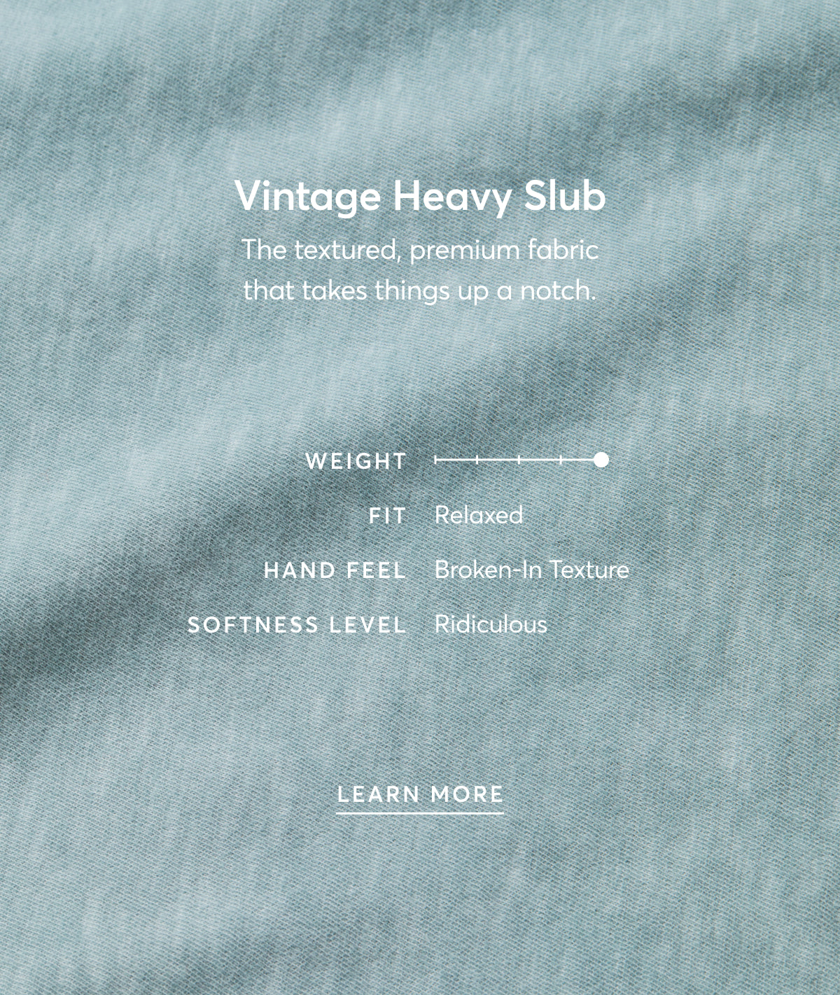 Meet our Vintage Heavy Slub. This all-star fabric is made from slub yarn, so it has a deep texture, while still being absurdly soft. Perfect for transitioning seasons, this heavyweight material has been garment-dyed for a broken-in, sun-faded look.